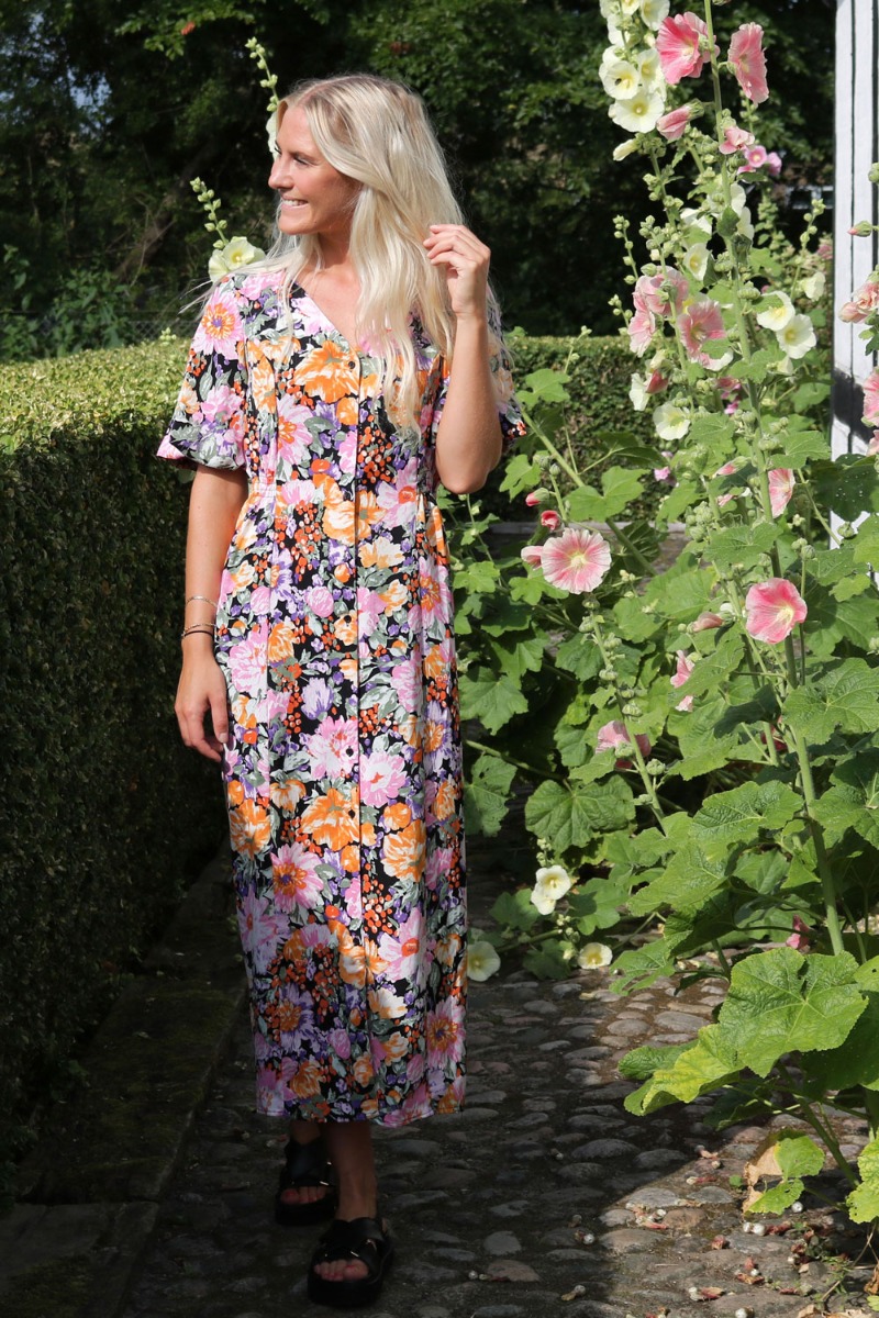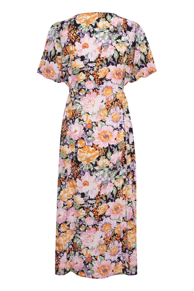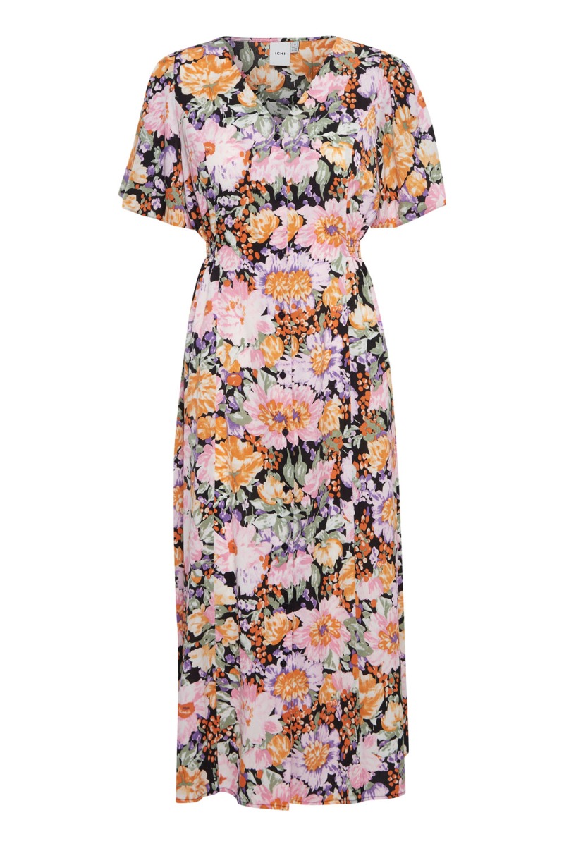 Ejj, se nu lige en kjole fra Ichi. Printet blev revet væk sidst og nu er det kommet i den smukkeste kjole. Den har en løs pasform med smock i siden der giver en feminin talje. Foran lukkes v-udskæring med knapper hele vejen ned og har de fineste ballonærmer.