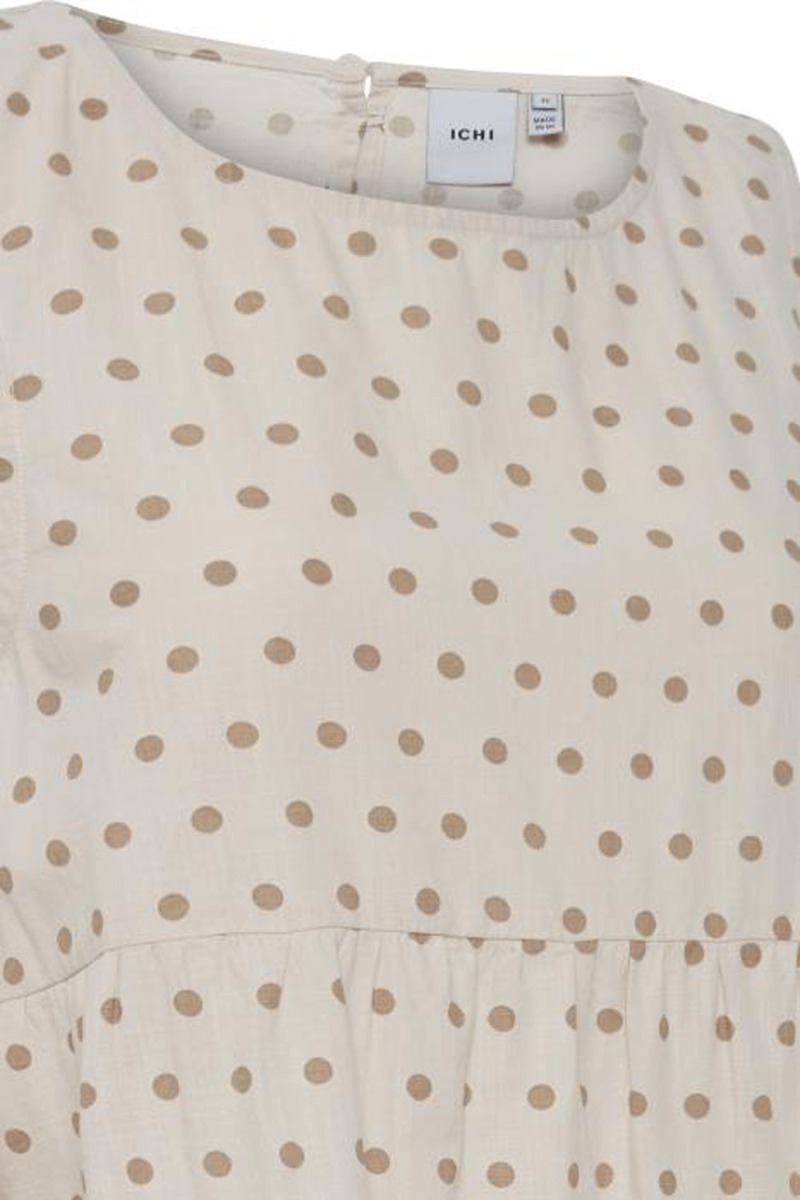 Sødeste prikket kjole fra Ichi i brune nuancer. Kjolen er lavet i et lækkert, luftigt materiale med rund hals der lukkes i nakken med knaplukning. Modellen er rummelig med peplum der giver et fint feminint udtryk. Style den gerne med en t-shirt under til de kølige dage.