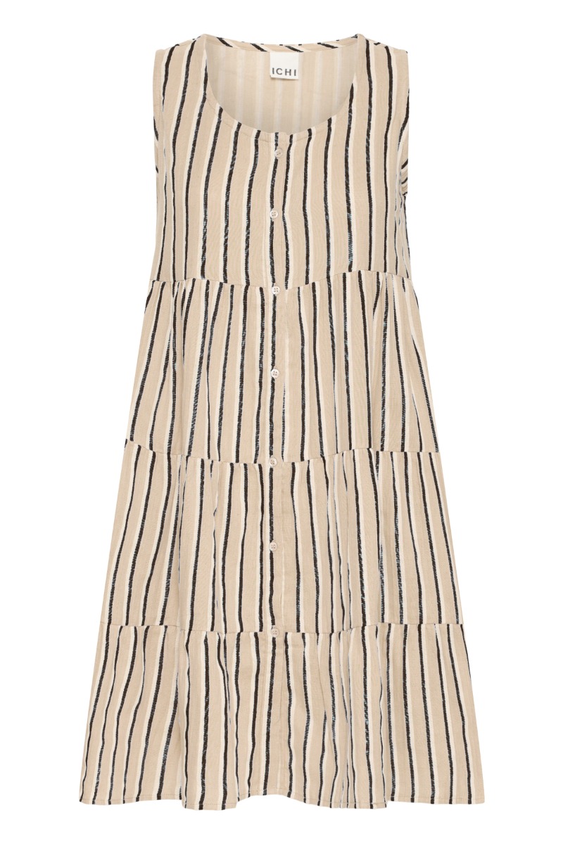 Let og sommerlig kjole i en varm beige nuance med fine mørke striber, der giver et afslappet og moderne udtryk. Designet uden ærmer med rund halsudskæring og gennemgående knaplukning foran. De bløde lagdelte skæringer skaber en luftig silhuet med flot fald, som gør kjolen både komfortabel og feminin – perfekt til varme dage med sandaler eller sneakers.