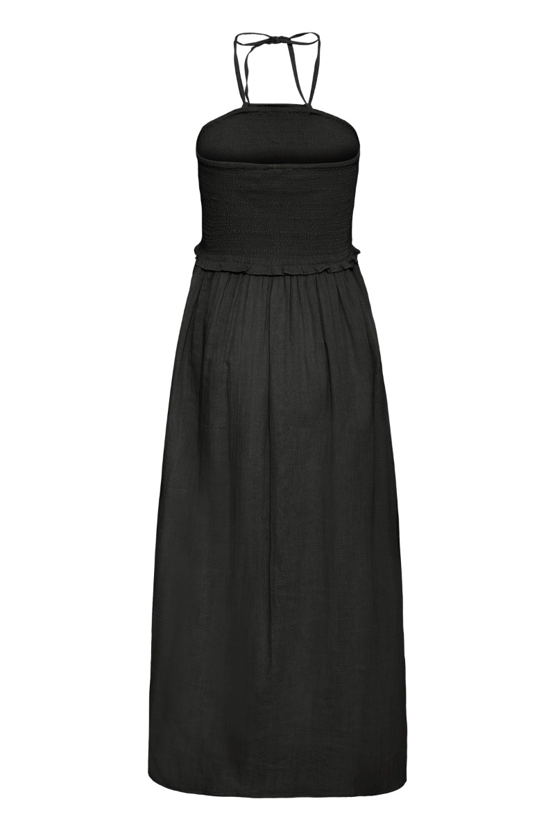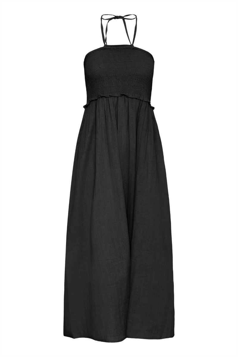 Sort top med smockdet overdel, der giver en fleksibel og behagelig pasform samt et feminint udtryk. Den har tynde bindestropper, som bindes i nakken, og en let flæsekant under brystet, der skaber en blød overgang og et luftigt fald. Enkel og stilren – perfekt til varme sommerdage.