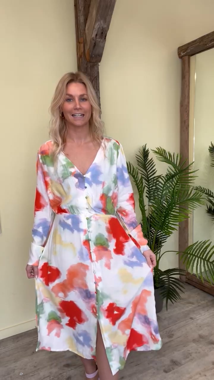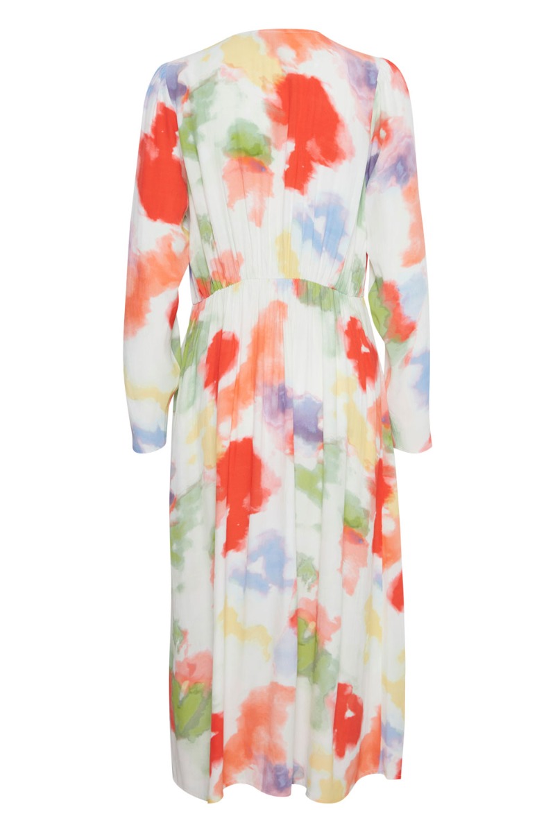 Denne kjole er med masser af skønne farver og man kan kun blive i godt humør af den. Den er fra Ichi og i en dejlig let kvalitet. Foran er der sat snydeknapper, hvilket er smart så den ikke åbner sig. Den har elastik i taljen og et A snit i bunden. Ærmerne er lange og smalle.