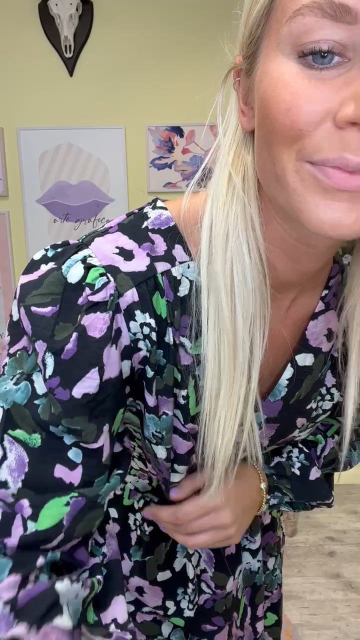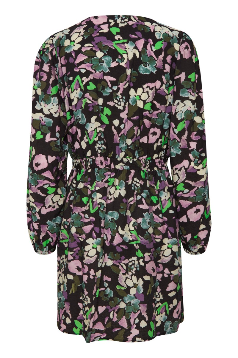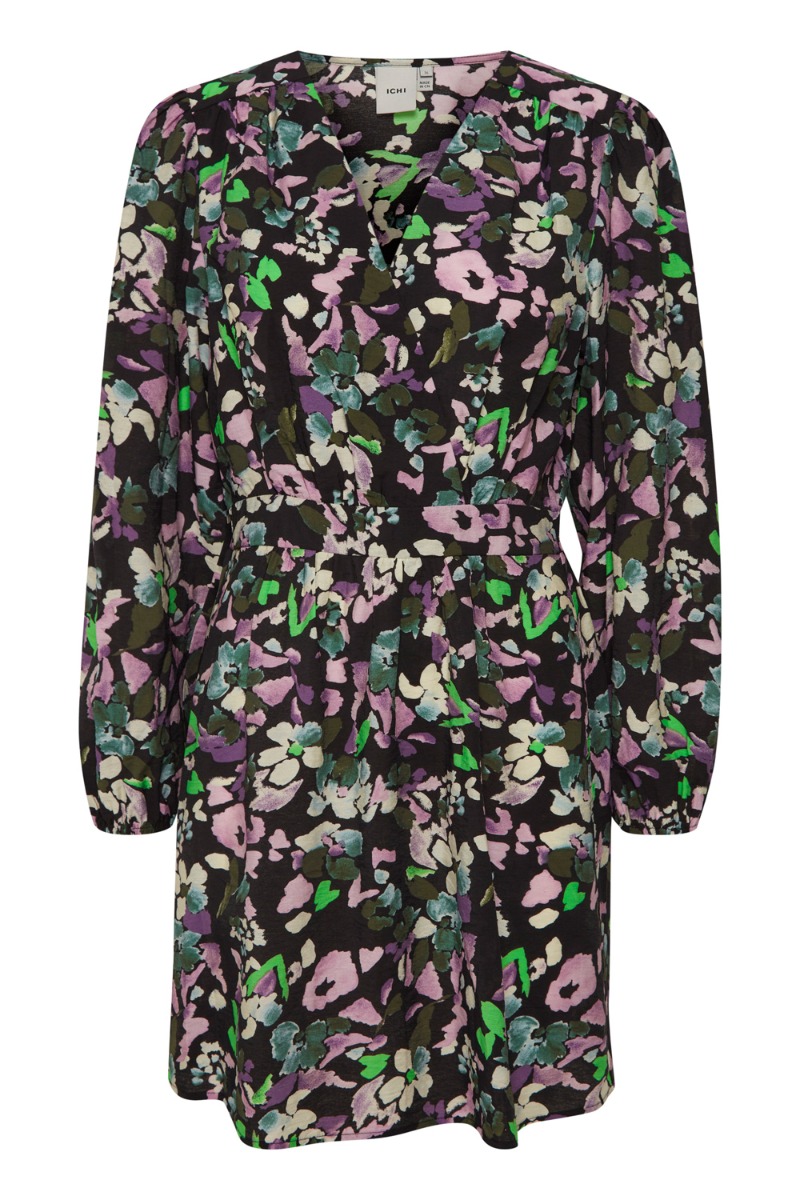 Feminin kjole fra Ichi i en sød pasform med talje. Kjolen er løs med elastik bagtil og fast stykke foran der skaber en virkelig smuk talje. Bundfarven er sort med et grafisk blomsterprint i rosa, lilla og grønne farver. Den går ned i v-udskæring foran der er riet fast ved brystet og har lange ærmer der afsluttes med en lille diskret elastikkant.