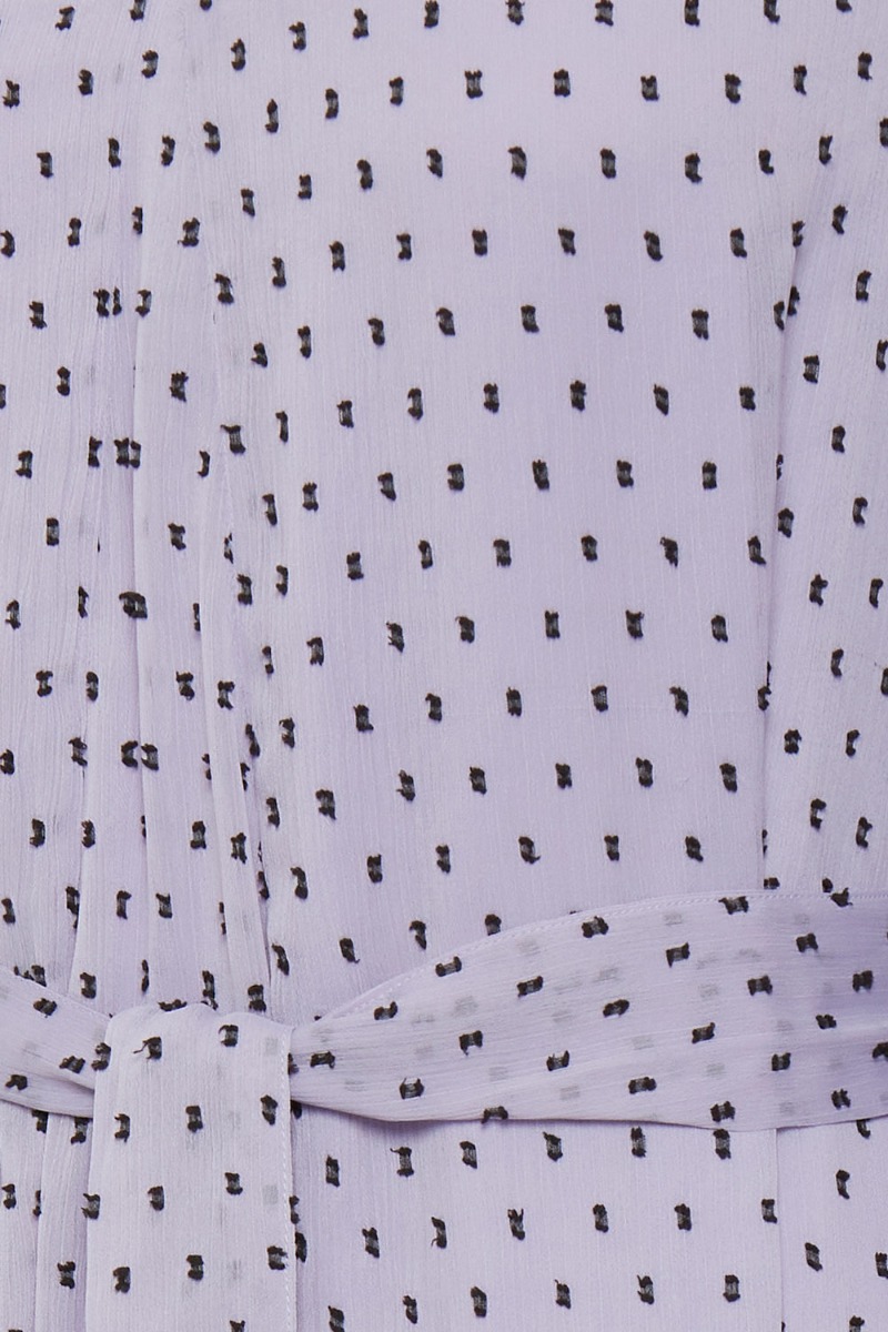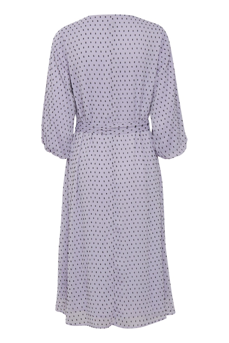 Feminin kjole fra Ichi i lilla med små sorte prikker. Kjolen er løst siddende med v-udskæring og 3/4 ærmer. Den har medfølgende bindebånd til at skabe en fin talje og gør kjolen mere elegant.