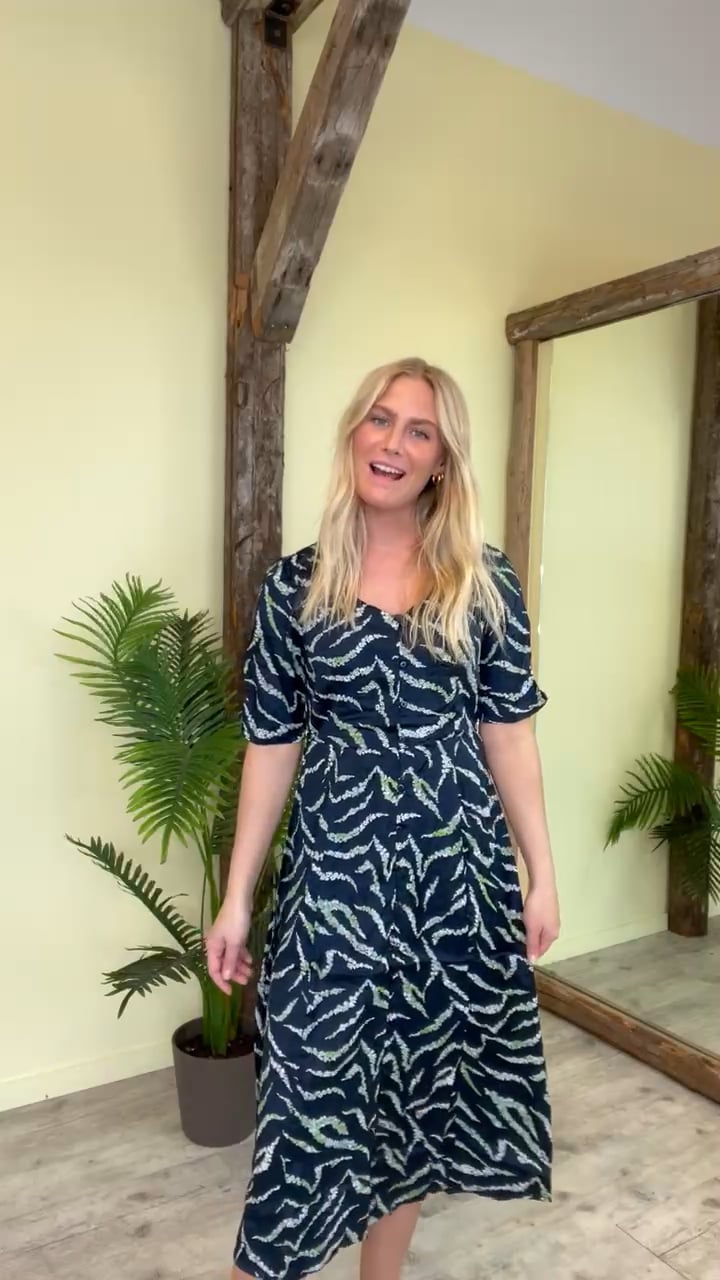 En smuk kjole fra Ichi i sort med grønt print. Den er med knaplukning foran fra top til bund og er derfor ammevenlig. Den har et A snit i bunden og har korte løse ærmer. Derudover er der sat en lille sløjfe detaljer som bindes bagpå i taljen.
