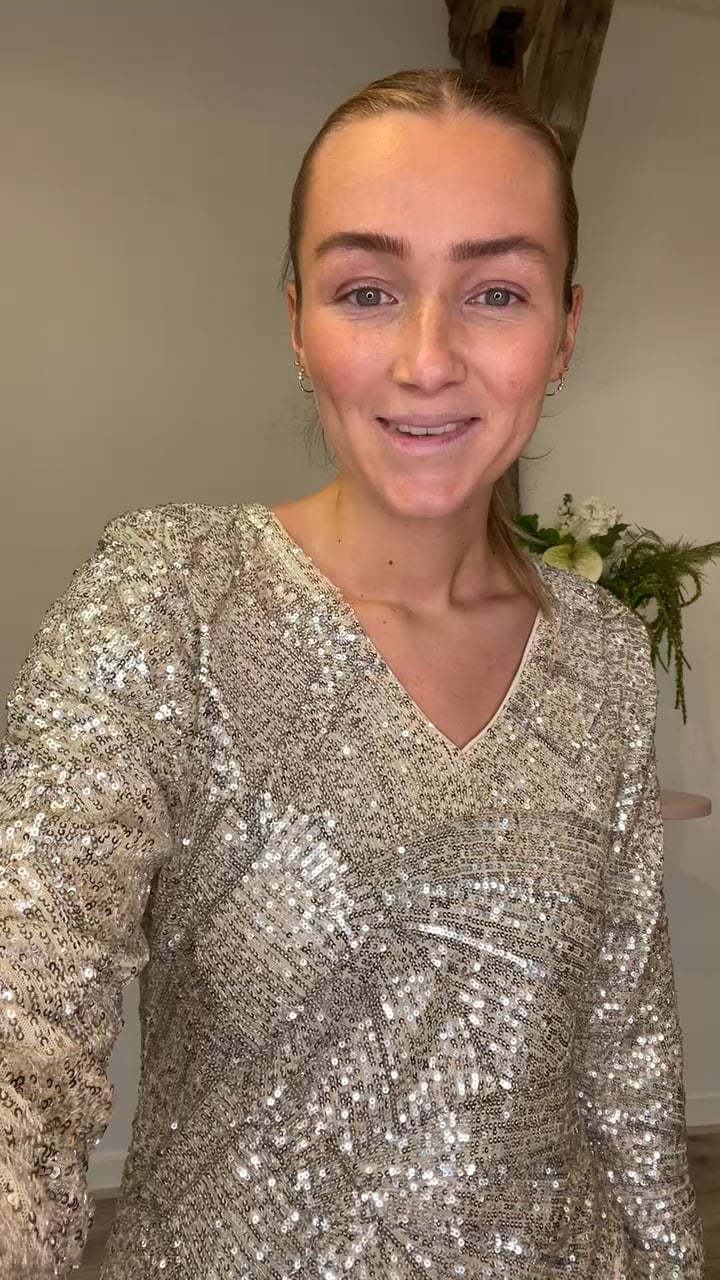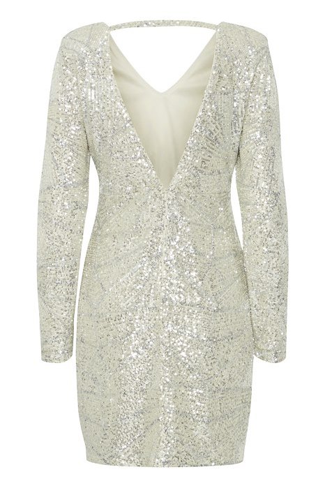 Så er den smukkeste festkjole fra Ichi landet! Denne kjole har det fineste mønster med palietter, lange ærmer og flot detalje på ryggen. Et super valg til diverse fester og begivenheder.