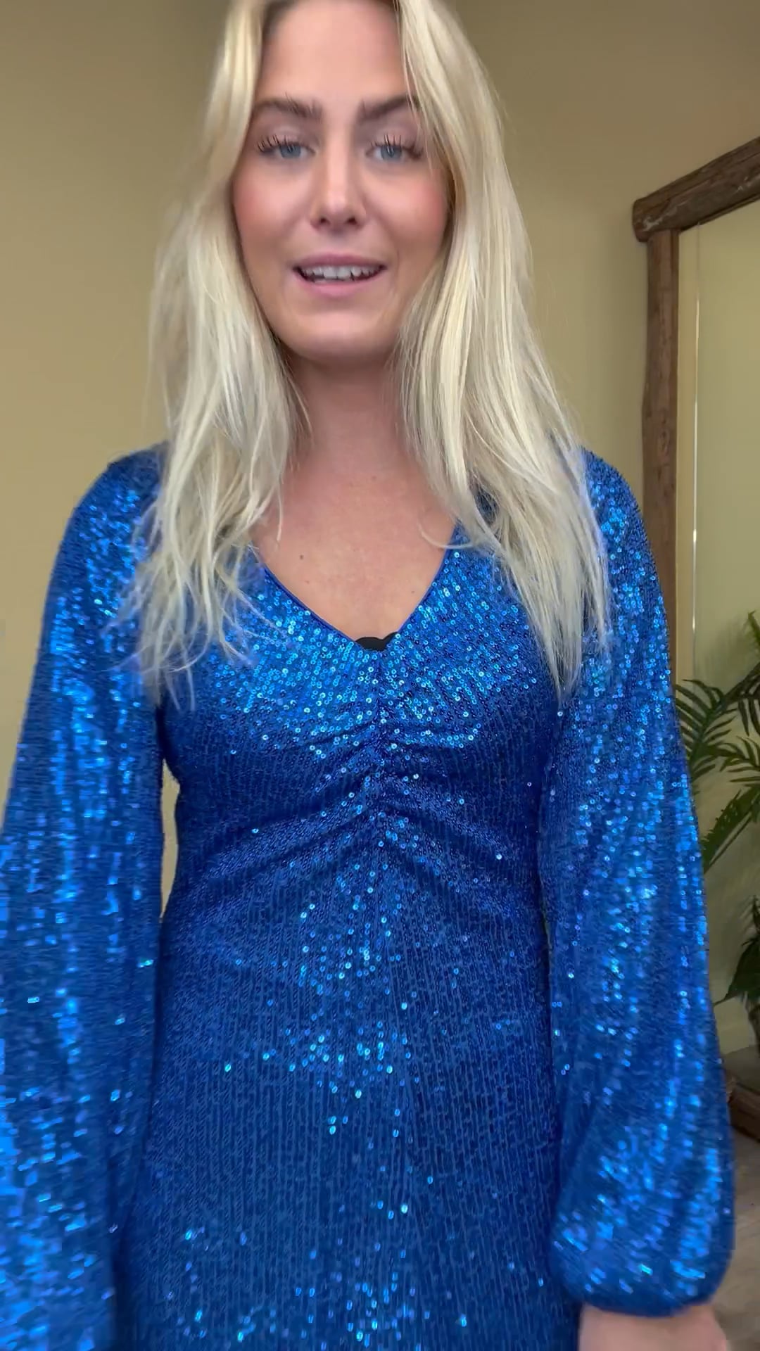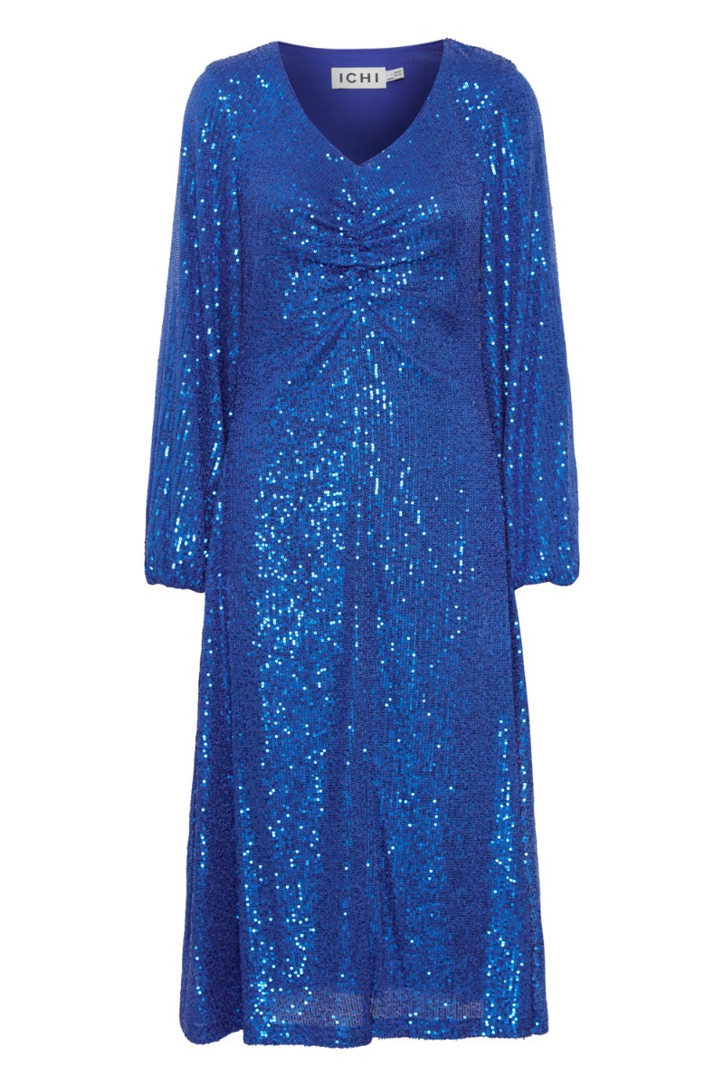 En smuk kjole er kommet i den flotteste blå farve fra Ichi. Den er med apiletter over det hele og er foret med en blød kvalitet så den ikke kradser. Den har V hals og en rynkedetalje ved brystet. Derudover er ærmerne lange med balloneffekt og bunden er i et A snit. Den findes også i sort.