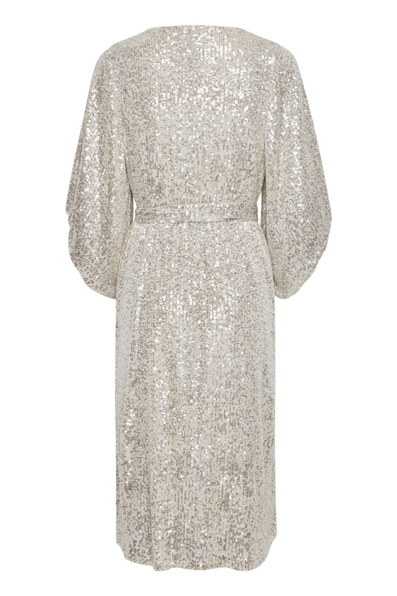 HOLD NU OP! En rigtig pailette kjole går man aldrig galt i byen med til alle julefrokosterne og nytår! Kjolen er løs med en lille v-udskæring og har matchende bindebånd med til at skabe en feminin talje. De trekvart lange ærmer afsluttes med skjult elastik der giver en flot volume. Style den med en helt enkelt stilet og hver aftenens midtpunkt.