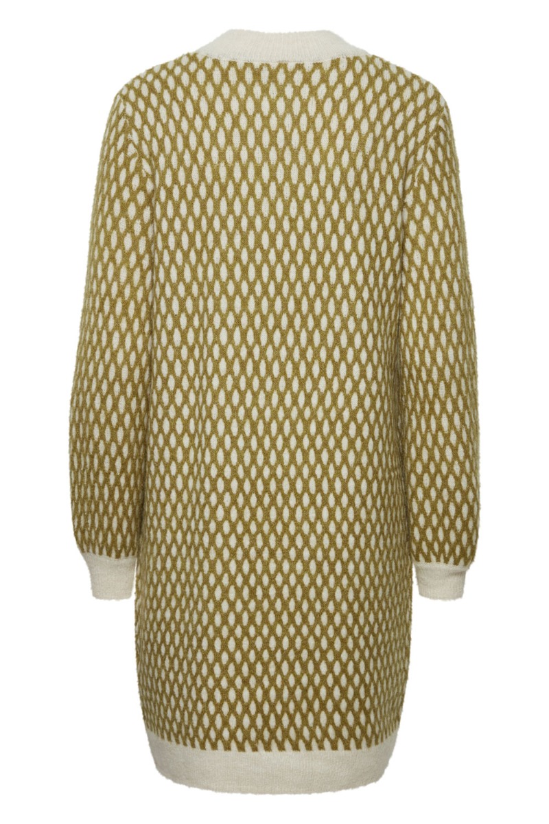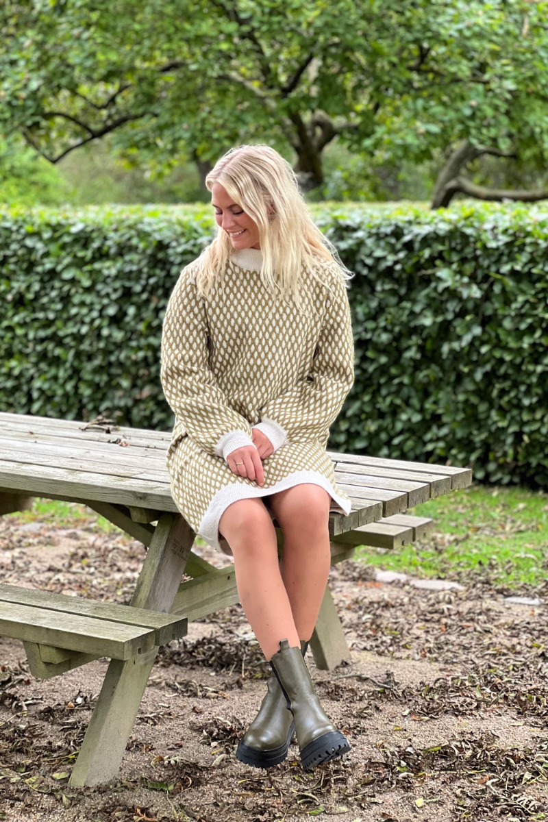 En dejlig hyggelig strik fra Ichi med grønt mønster. Strikken er en velkendt model der nu er kommet i en cool kjole som man bare har lyst til at bo i alle de kolde dage. Kjolen er med o-neck og lange ærmer i en løs model der har plads til en babybule.