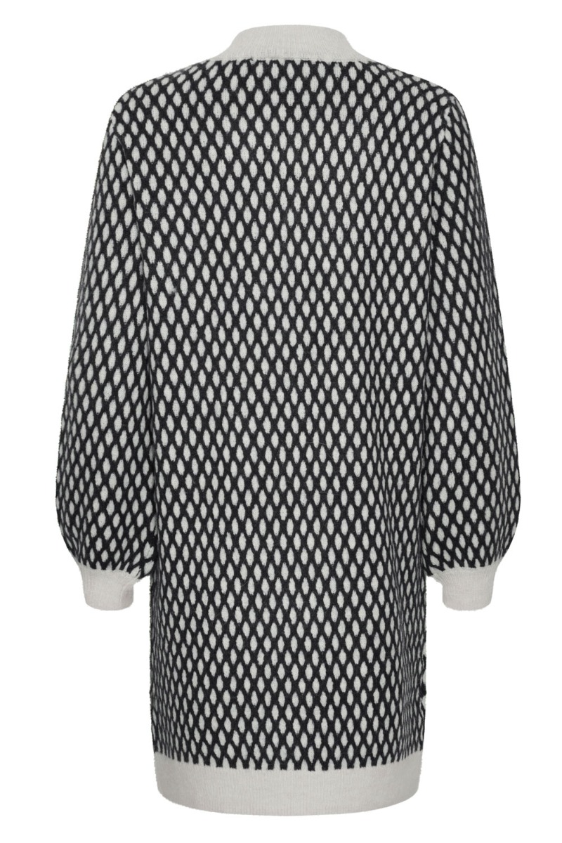 Denne strik kjole har vi i flere farver og nu er den så landet med navy farvet mønster. Kjolen er fra Ichi og i en blød kvalitet. Derudover er den løs i pasformen og afsluttes med ribkant ved ærmer, hals og bunden. Brug den gerne til et par strømpebukser.
