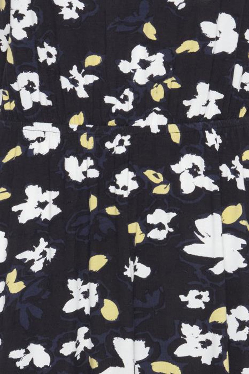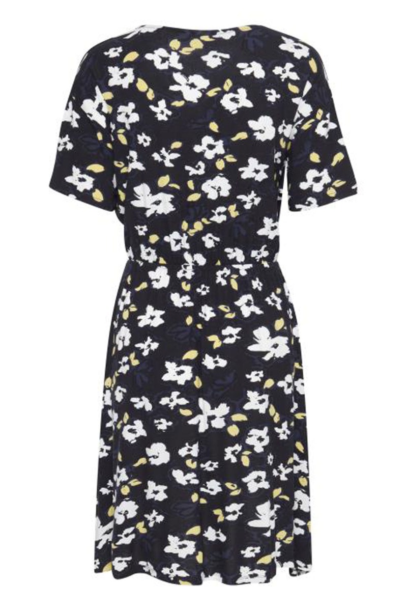 Skøn kjole fra Ichi der er lavet i et behageligt bæredygtigt materiale. Bundfarven er navy med blomsterprint i gule, sorte og hvide nuancer. Modellen er løs med elastik i livet der giver en feminin talje. Den er super skøn til en varm sommerdag med en sneaks eller sandal.