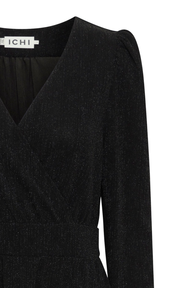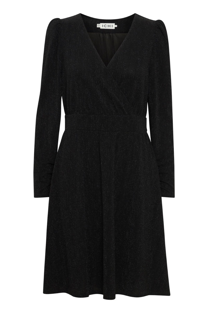 Den smukkeste kjole fra Ichi er kommet i en klassisk sort farve. Den er med slå-om effekt ved bystet, men er dog fastsyet då den ikke åbner sig. Den er med lange tætsiddende ærmer og har A snit i bunden. Derudover er den blød på indersiden og i strækbart materiale. Den findes også i pink.