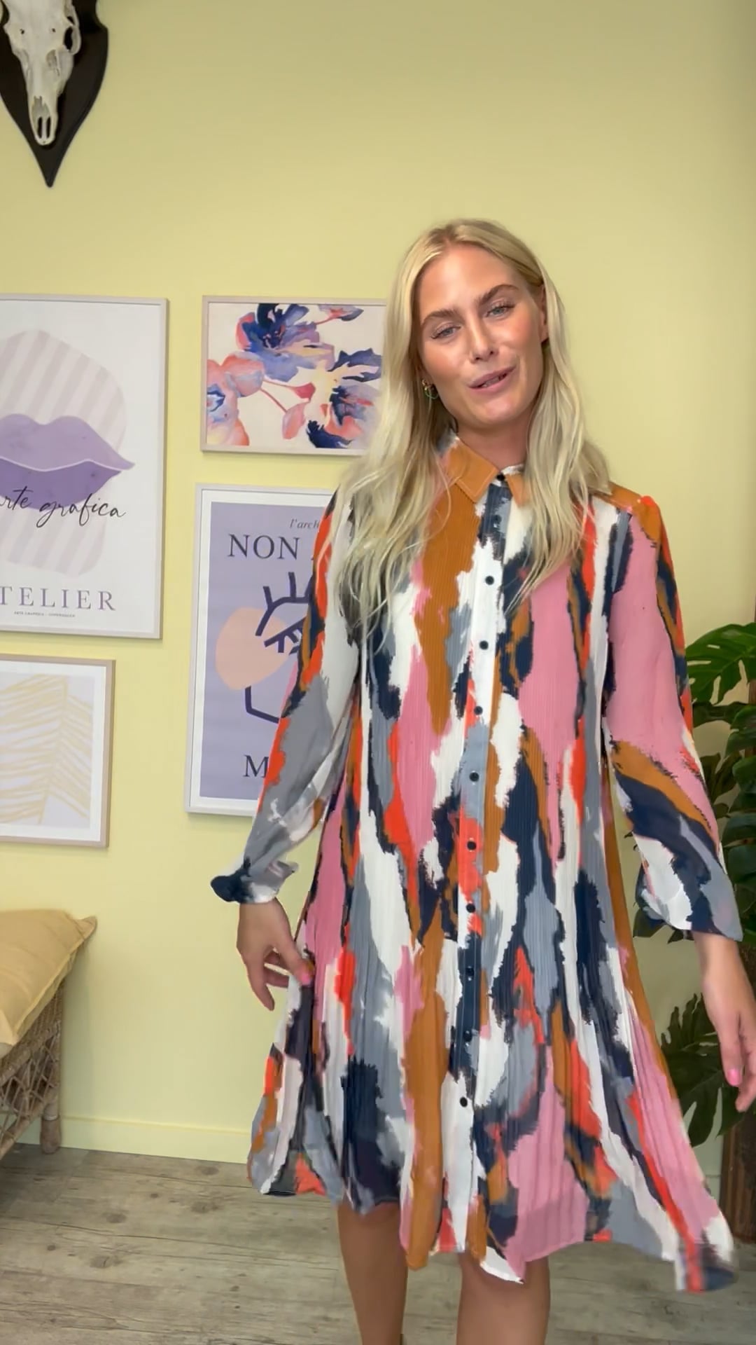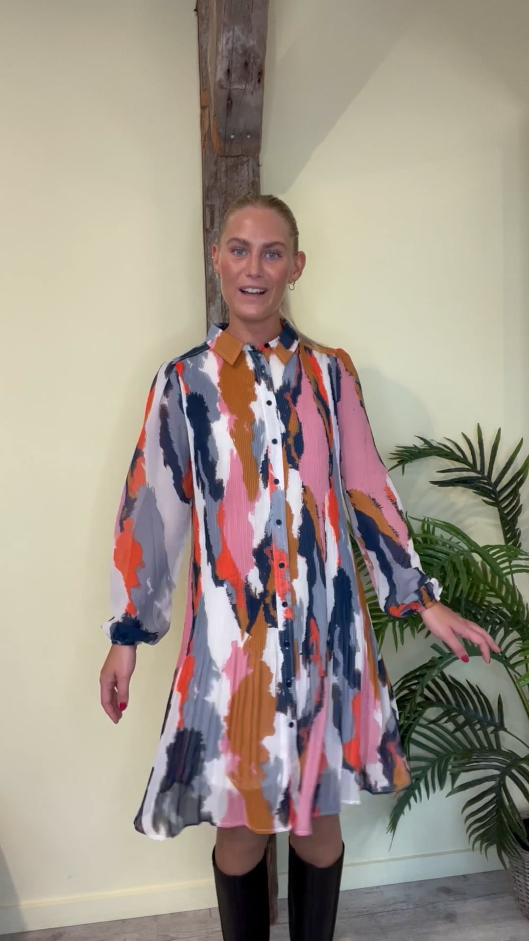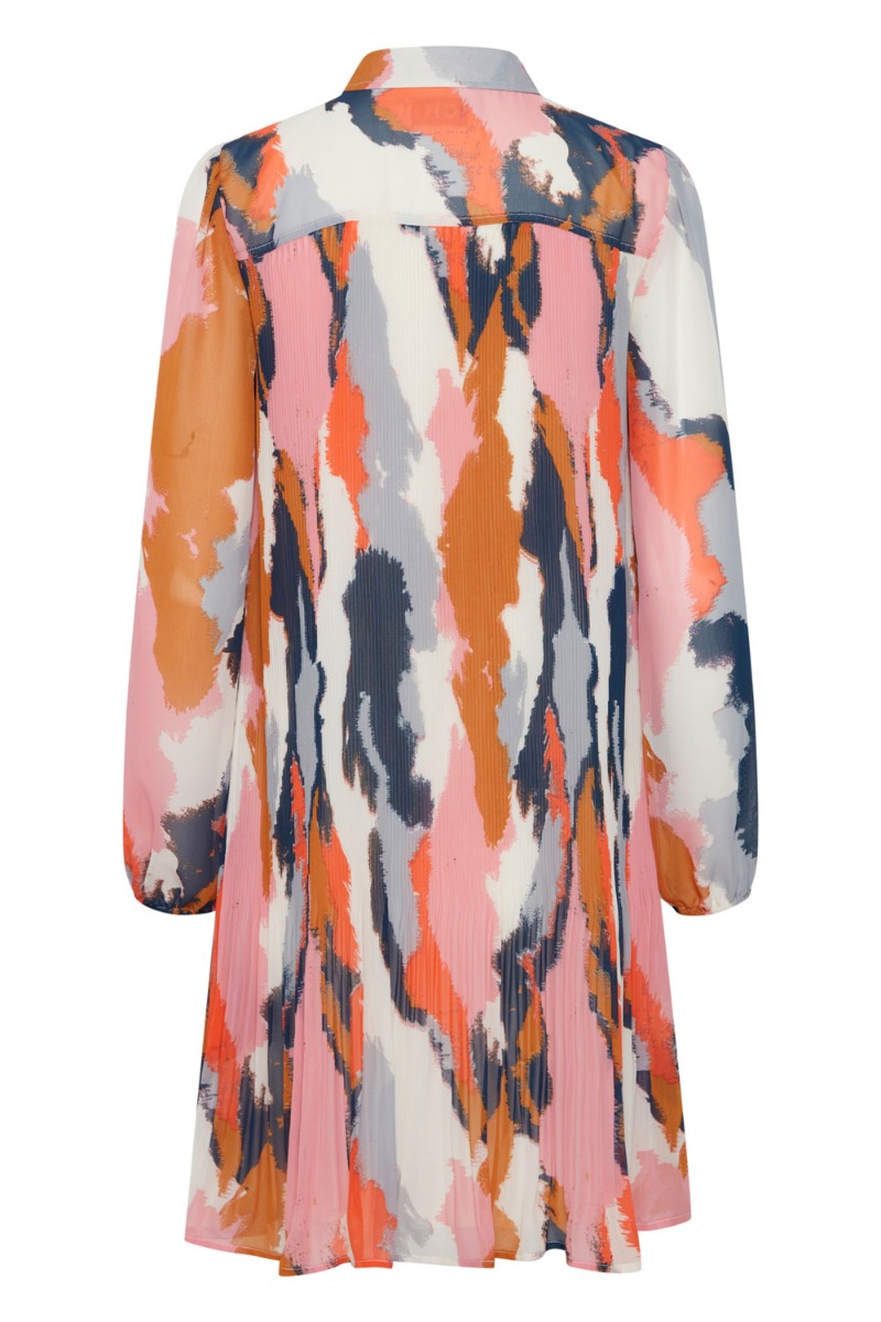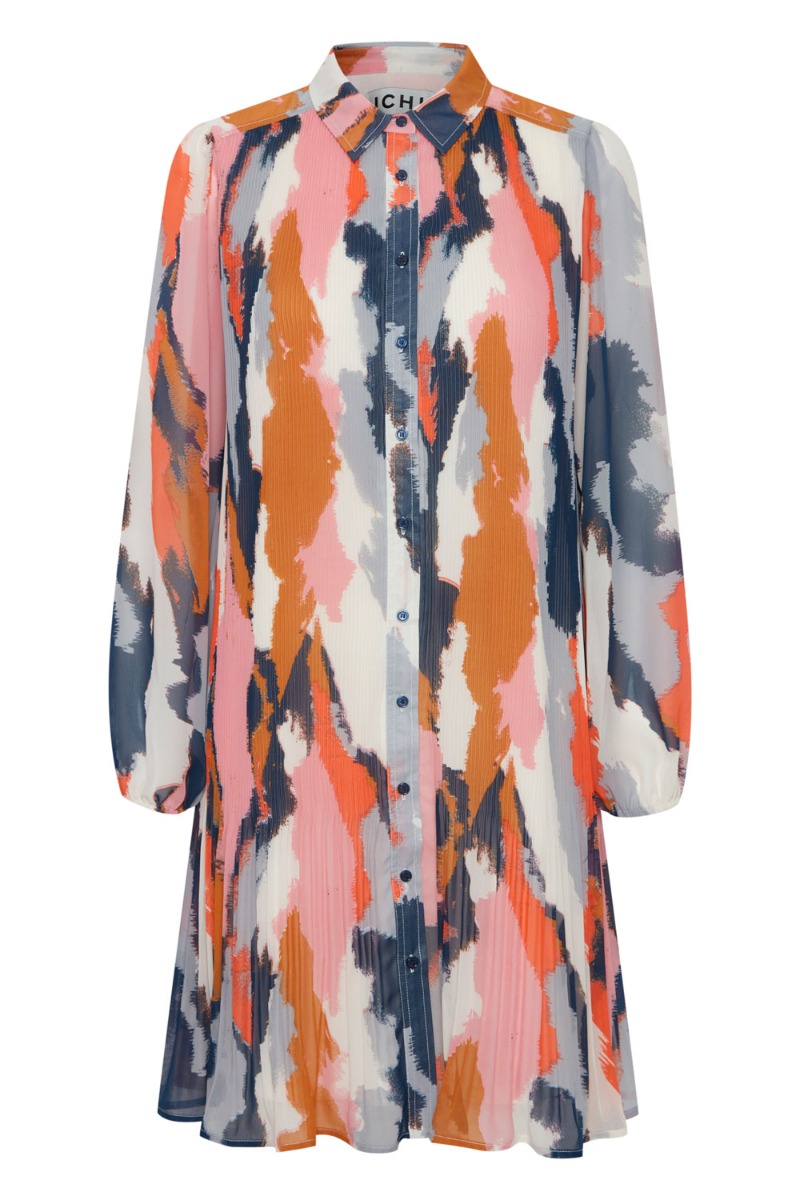 Multifarvet Ichi kjole med plisseret detaljer. Bundfarven er hvid med grafisk print i flere skønne farver og perfekt til denne sæson vi går imøde. Den har et klassisk a-snit der bare altid er nem at hoppe i og klæder de fleste kropstyper. Foran lukkes den med knapper hele vejen ned og har let gennemsigtige ærmer.