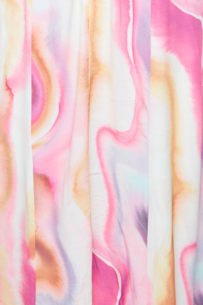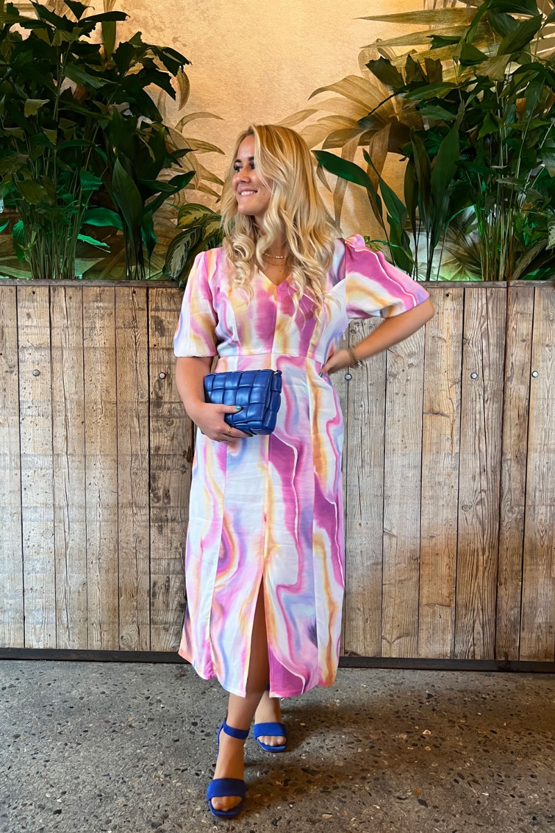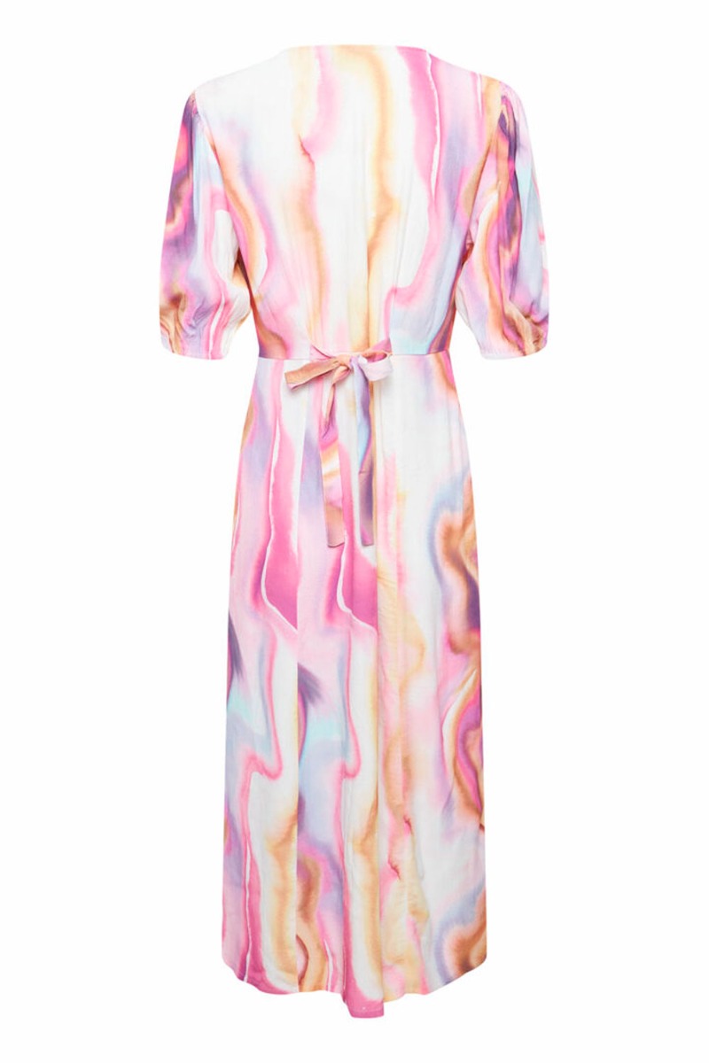 Smukkeste multifarvet kjole fra Ichi. En skøn kjole i et langt snit med en løs pasform. Den er designet med korte ballonærmer, en flot v-udskæring, slids foran, samt bindebånd bagpå som giver den fineste talje! En super skøn kjole som er oplagt til forårets fester, bryllupper og meget mere!