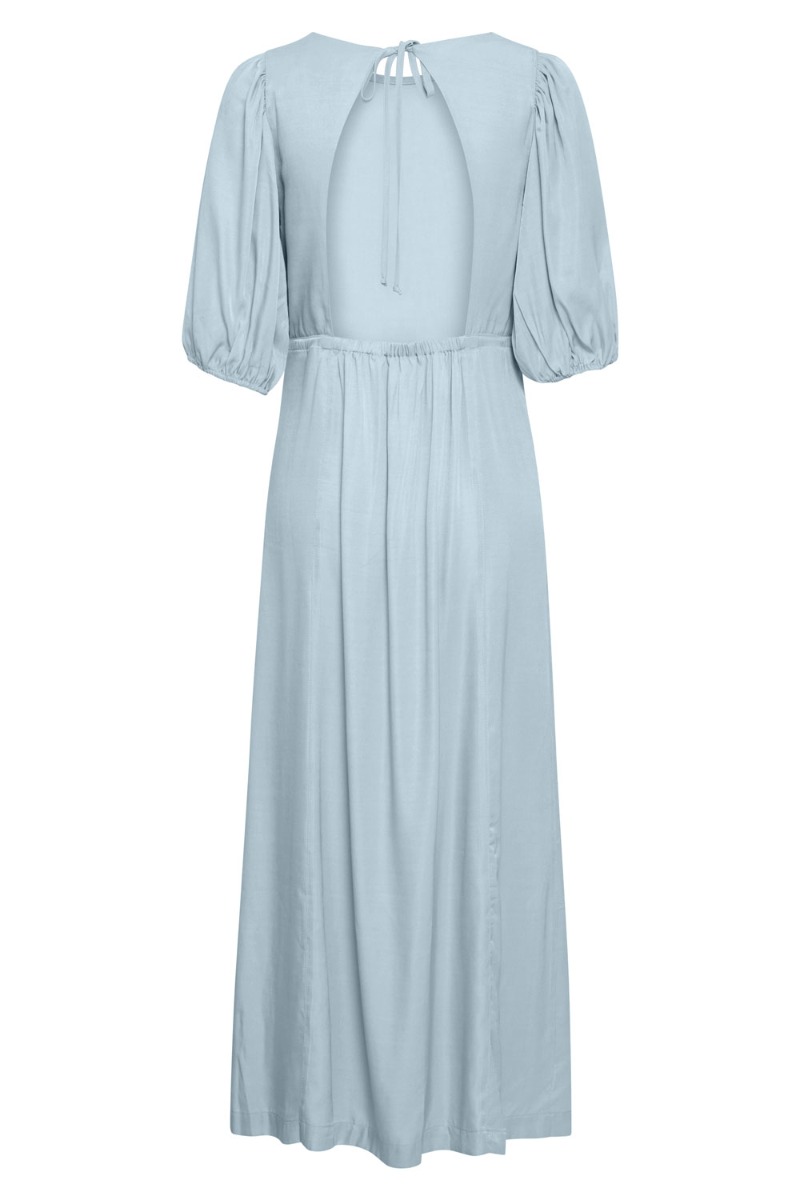 En smuk kjole fra Ichi er kommet i en let kvalitet og i en endnu smukkere lyseblå farve. Den er med korte pufærmer og har en fin sløjfedetalje i nakken. Derudover er der slids i bunden i den ene side. Vi underbefaler at du bruger et par undershorts under da den godt kan være en smule gennemsigtig i sollys.