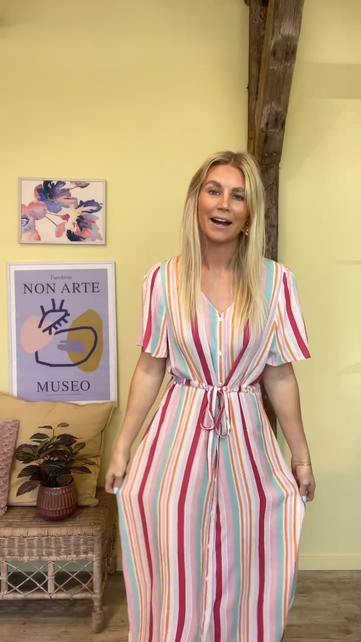 Super sød sommerkjole fra Ichi. Kjolen er i et flot sommerprint med nuancer af pink, orange og lyseblå. Den har en løstsiddende pasform med løstsiddende t-shirt ærmer og et længere snit. Den er designet med knapper foran på brystet og derfor super ammevenlig. Derudover har den bindebånd i taljen som kan gøre den ekstra feminim i pasformen. Styl den til sommeren med en hvid sneakers eller en farverig Havaianas sandal.