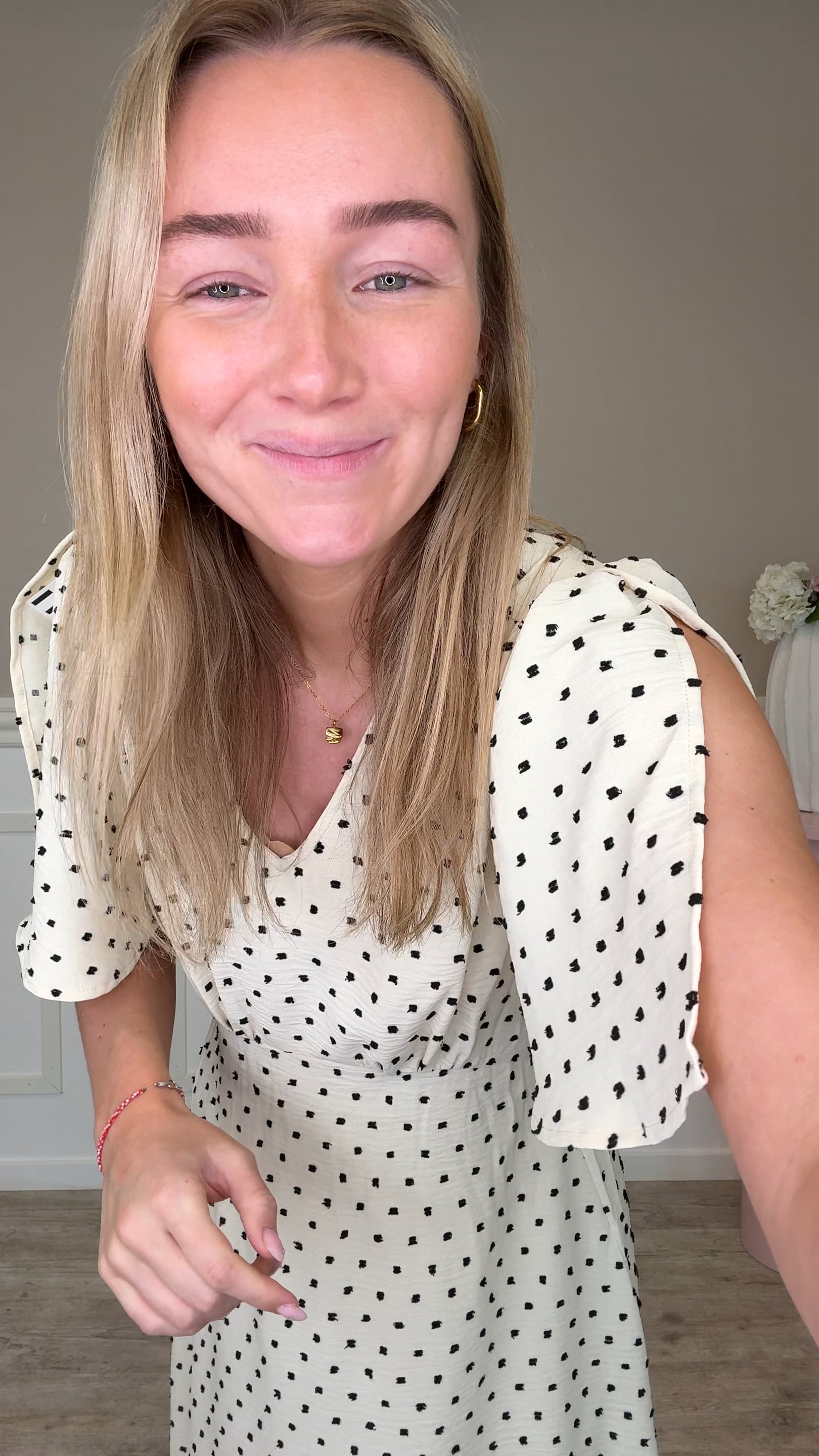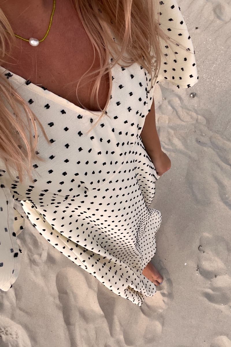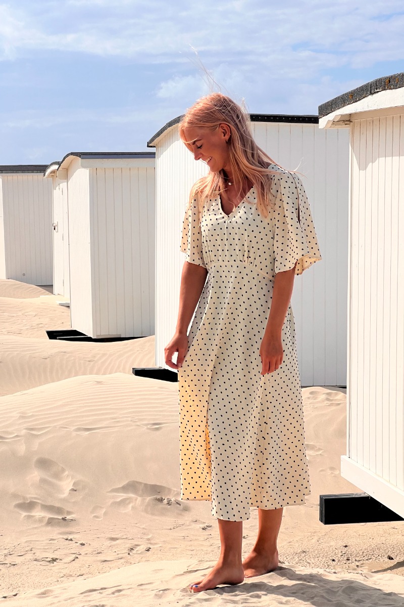 En virkelig smuk kjole fra Ichi i en beige farve med fine prikker. Denne kjole har korte og luftige ærmer, den er syet ind i taljen og falder løst om benene. Kjolen er super fin til et par sneakers til hverdag, men kan bestemt også bruges med en stilet.