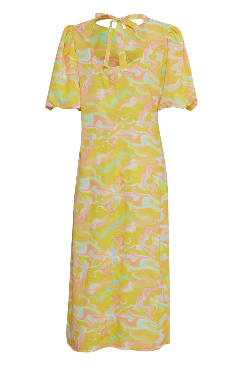 Smukkeste sommerkjole fra Ichi i et flot swirly print i gul, blå, coral og lyserøde nuancer. Kjolen har et feminint snit der går en smule ind i livet og giver en flot talje hvor den falder løst langs kroppen med slids foran. Kjolen bindes i nakken hvilket skaber en flot åbning bagtil. Den har skjult lynlås i siden og perfekt både til fest og hverdag med en slippers.