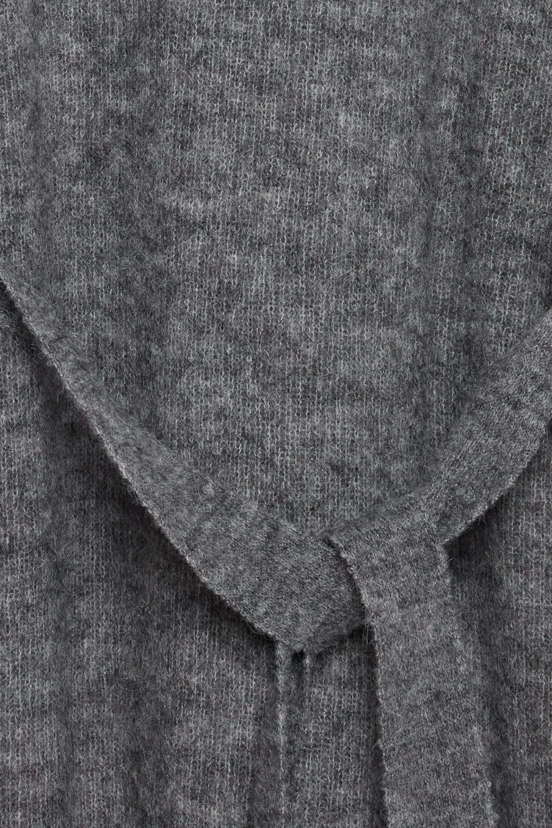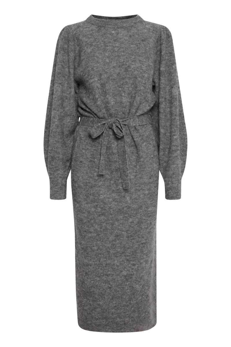 En super skøn strikket kjole med pufskuldre fra Ichi i en klassisk grå melleret nuance. Kjolen er lang med slids i begge sider og medfølgende bindebånd der skaber en feminin pasform. Style den med en grov støvle til efteråret.