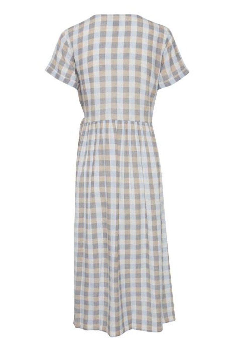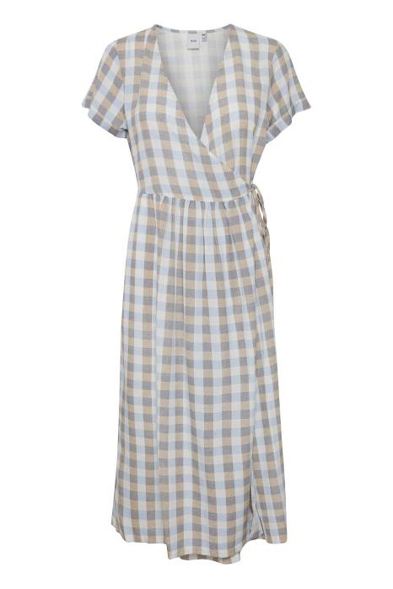 Ternet kjole fra Ichi i brune og blå nuancer med slå-om i siden, der skaber en smuk feminin v-udskæring som gør kjolen ammevenlig. Modellen er løs med en tæt talje alt efter hvor stramt du binder den. De korte t-shirt ærmer har et lille opsmøg der er riet fast. Style den med en sneaks eller sandal til de solrige sommerdage.