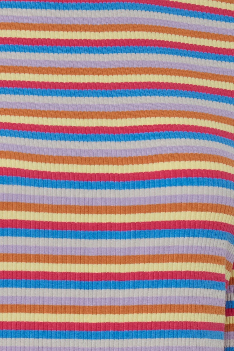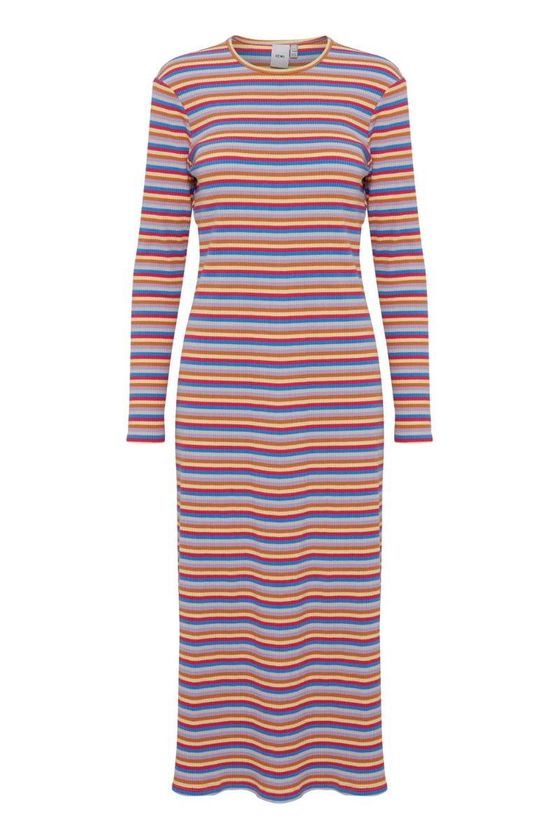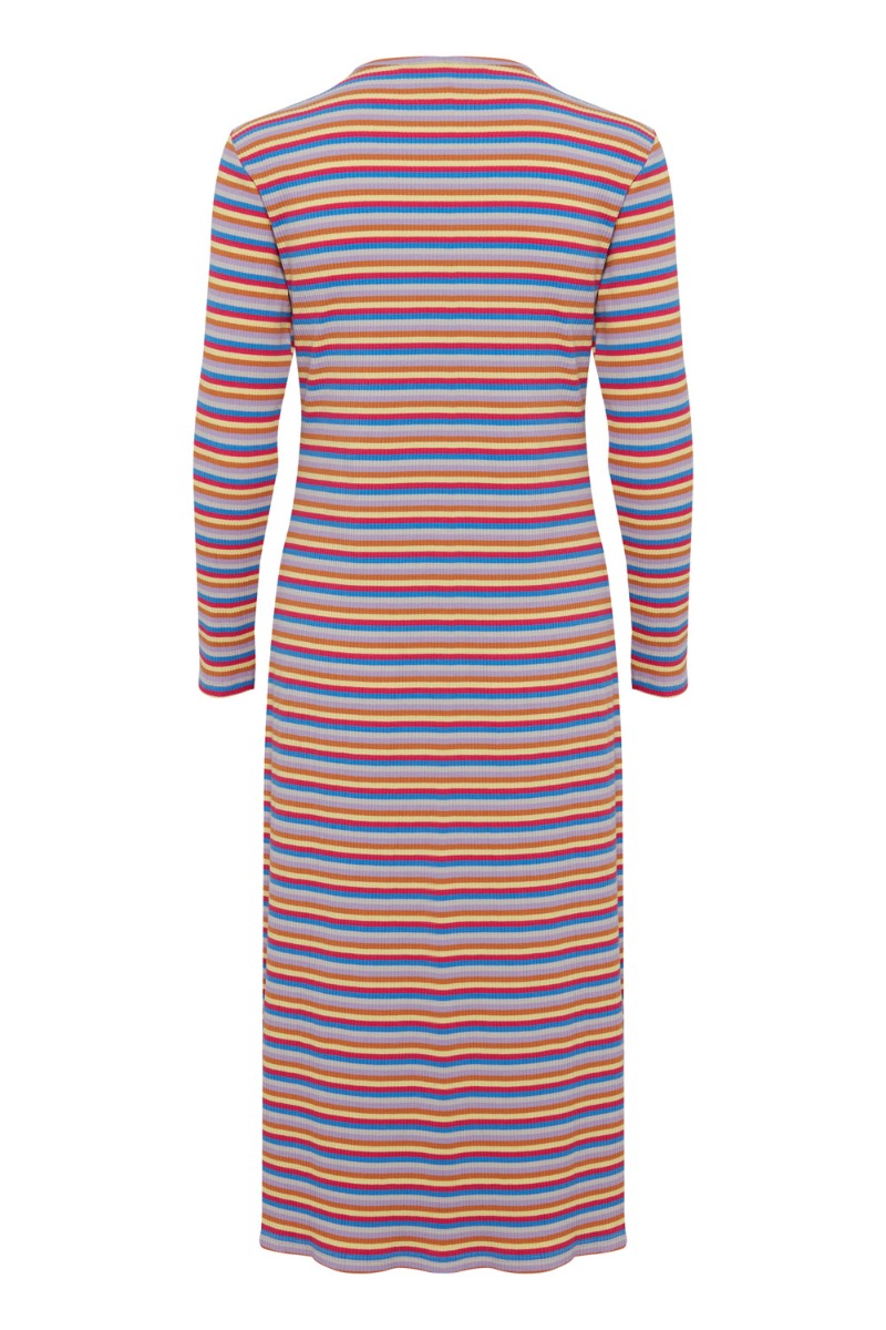 Vi er stor fan af denne skønne kjole fra Ichi. Den har de dejligste farvet striber i rød, blå og gul der er iøjenfaldende. Kjolen har lange ærmer i en tætsiddende pasform med masser af stretch. Den har slids i begge sider og er perfekt at style både med og uden en babybule.