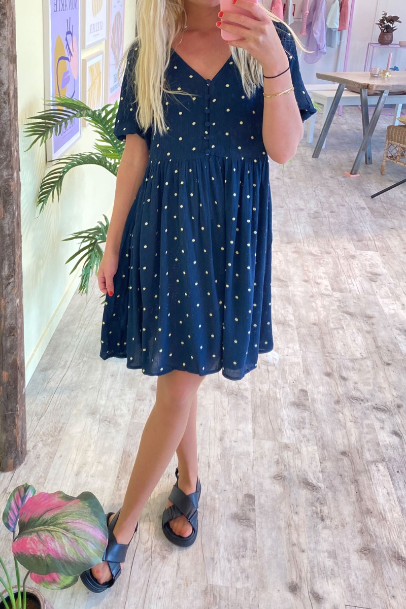 Mørkeblå kjole fra Ichi med små gule prikker. Kjolen er rummelig med en lille v-udskæring der lukkes med stofbetrukket knapper foran. Den har en tydelig syning i taljen der giver en sød to-delt-effekt og er super dejlig til de varme dage.