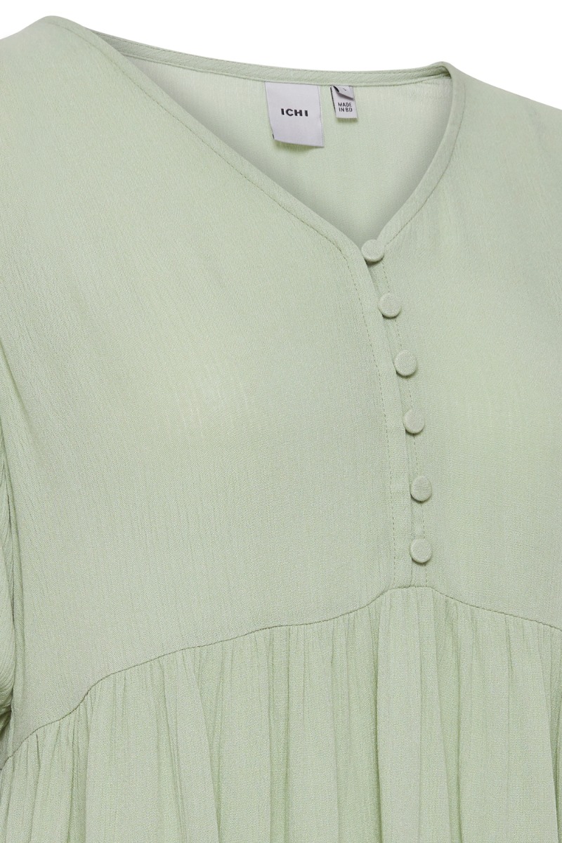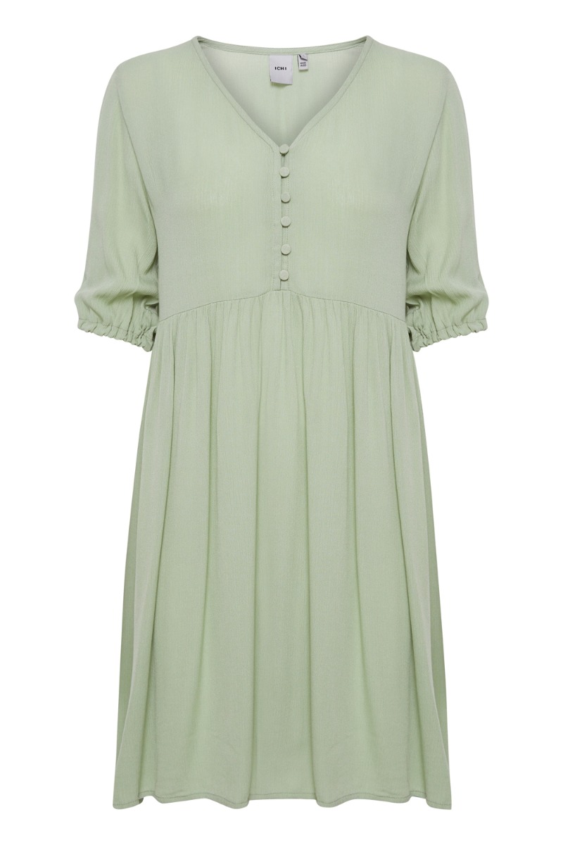 Så flot kjole fra ICHI i en støvet mintgrøn. Den har de fineste ballonærmer og v-udskæring foran. Der er knapper foran i det øverste stykke som er stofbelagte. Der er en to-dels-effekt med et skørtelook. En dejlig pasform som er så skøn at have på hele dagen.