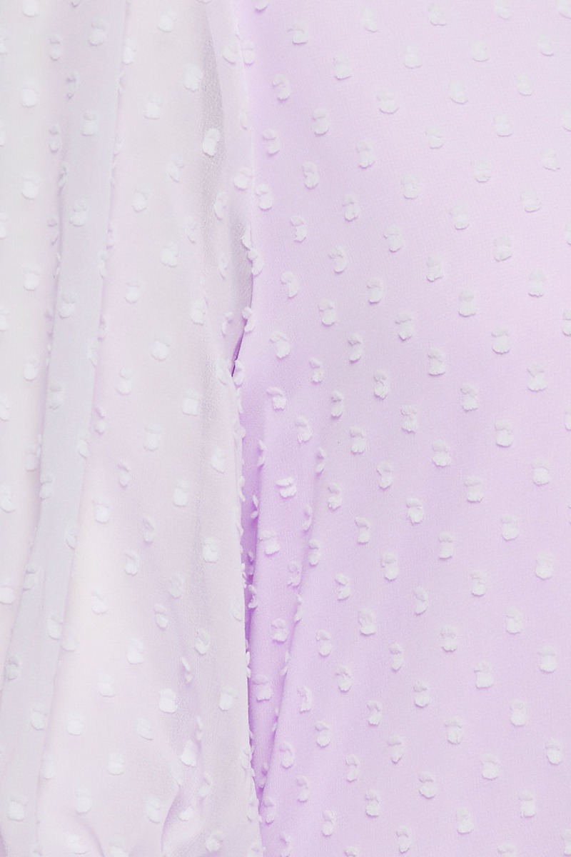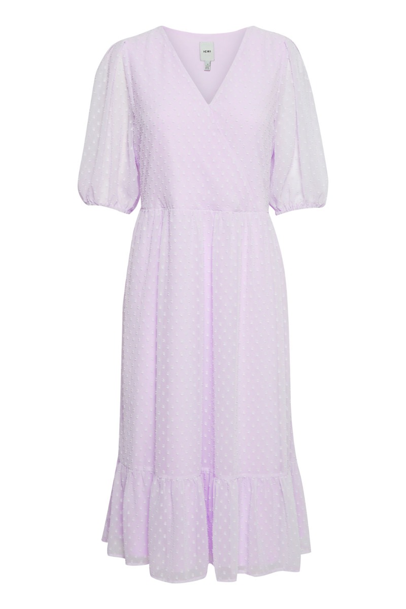 En rigtig smuk sommerkjole fra Ichi i lavendel med små præget prikker. Kjolen er løst med en tydelig syning i liver der giver en sød to-delt-effekt med peplum i bunden. Foran går den ned i v-udskæring der er syet fast så den ikke får op. Ærmerne er afsluttes med elastik og giver et lille løst puflook. Style kjolen med en enkel stilet.