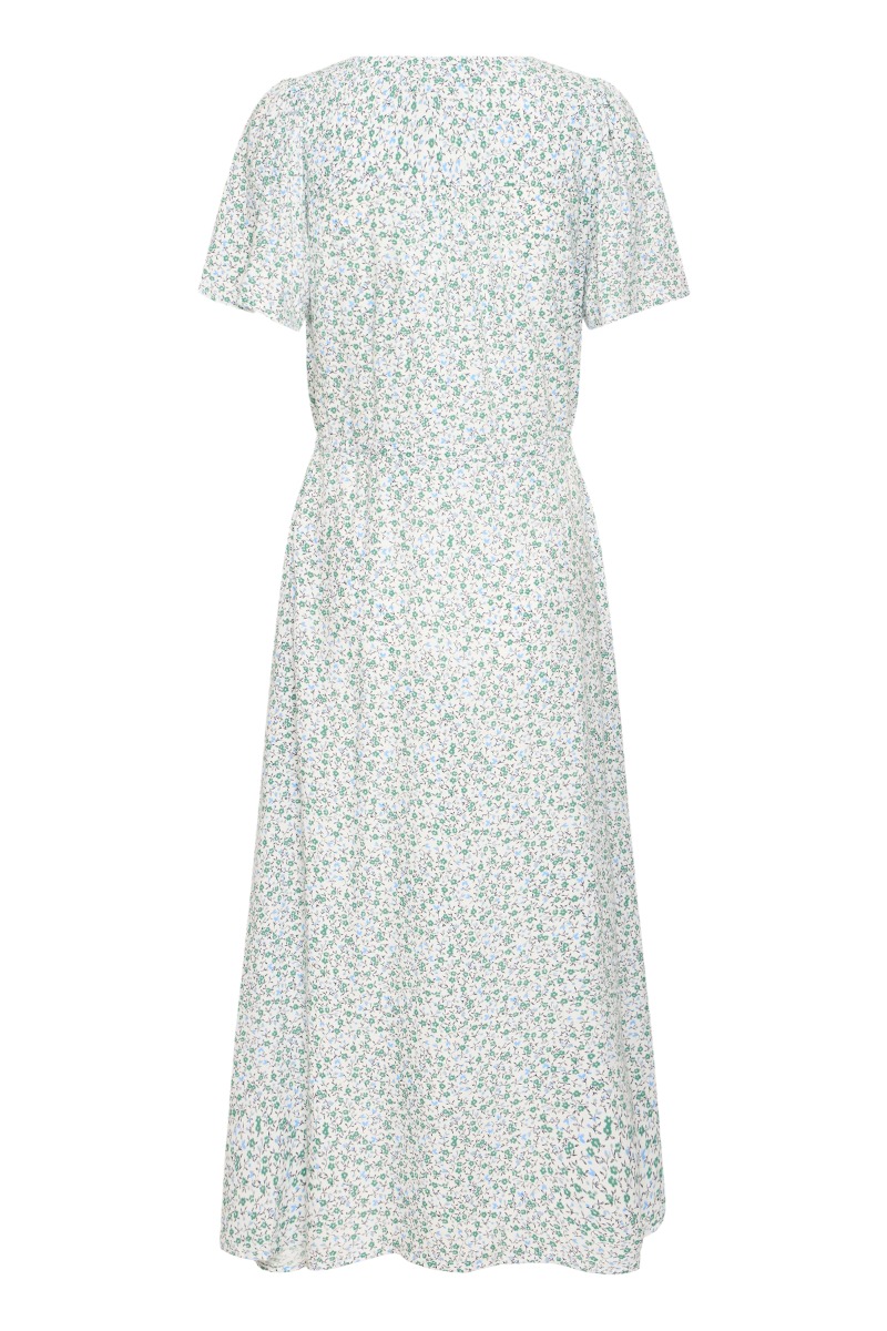 Den sødeste sommerkjole fra Ichi er kommet i blomstret print i grønne farver. Den er med bindbånd i taljen som nemt bruges til at give noget figur til stylen. Den er perfekt til hverdag med en sandal og så findes den også i røde farver.
