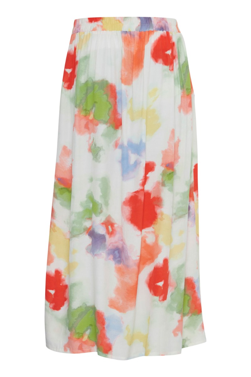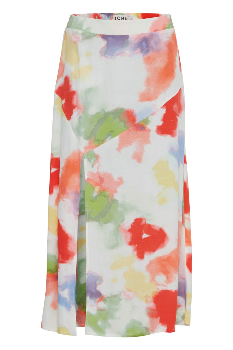 En fin nederdel i et smukt print med masser af farver. Den er fra Ichi og kan nemt styles styles sammen med en simpel t-shirt da nederdelen står så flot alene. Den er i en dejlig let kvalitet og har elastik i taljen. Dog ikke foran så den får dette glatte udtryk her. Den er med A snit og har derfor masser af vide. Der findes en matchende top til.