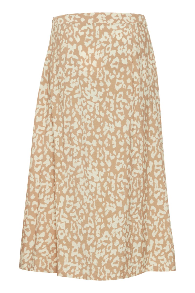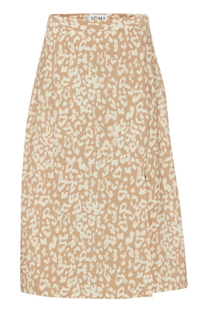 En fin nederdel fra Ichi med lynlås i taljen og i leo print i beige nuancer. Den er lmed A snit og let i kvaliteten. Derudover findes der en matchende overdel og du kan nemt lave et sæt.
