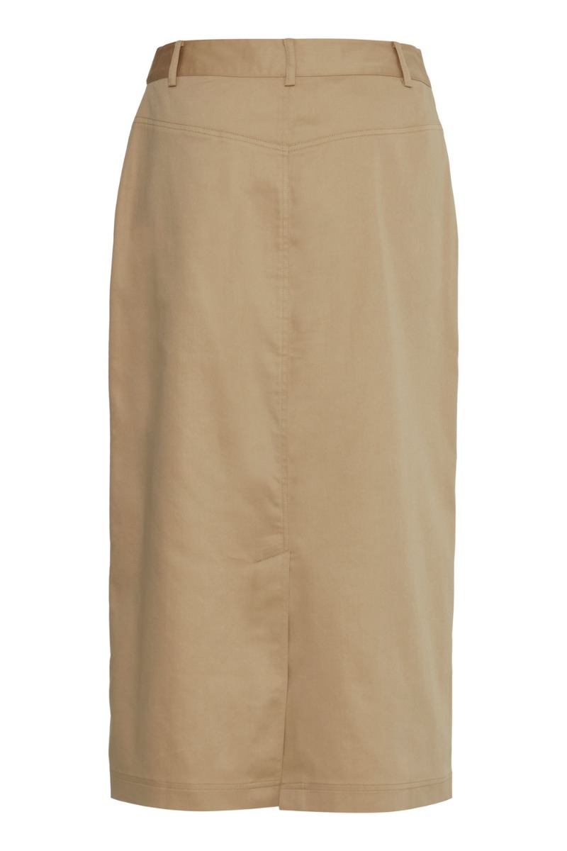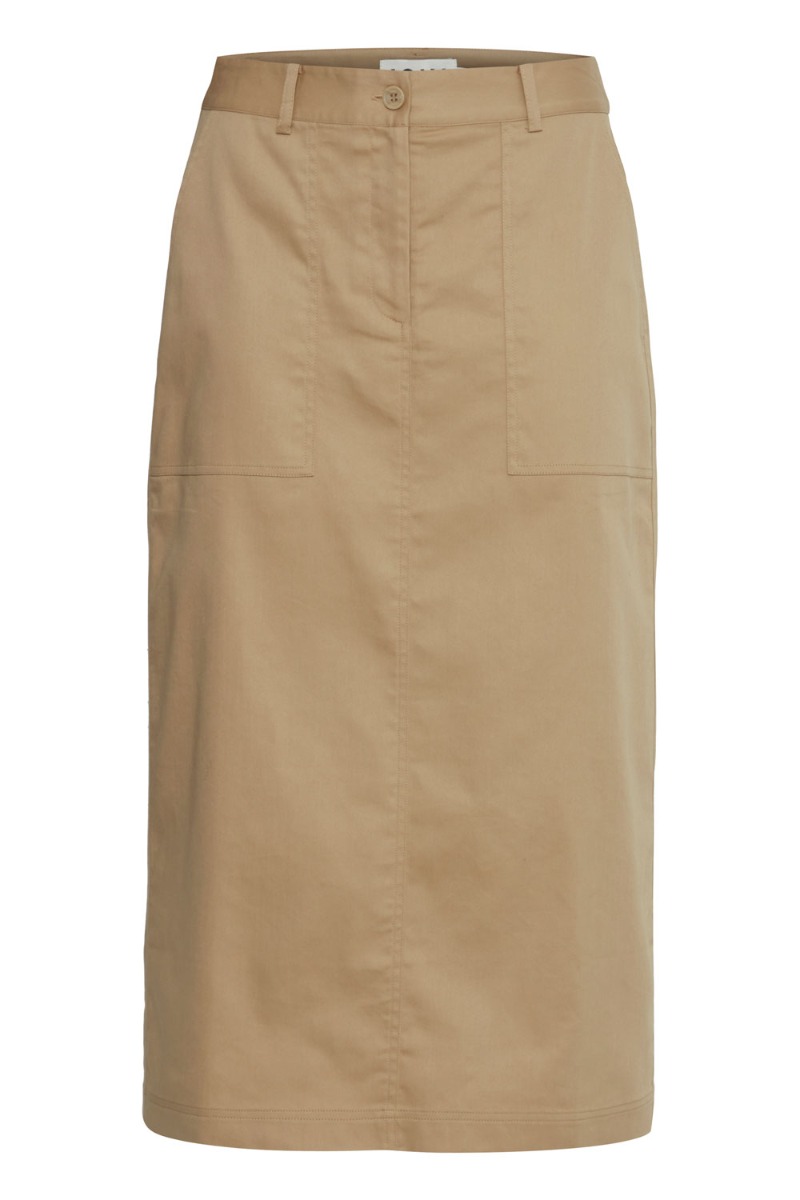En fin nederdel er kommet fra Ichi i et cargo look. Den er i en smuk sandfarve og med dybe lommer foran. Derudover er der bæltestropper i taljen og en slids bagpå. Den er lang i modellen og tætsiddende. Men fordi kvaliteten er uden stræk så er den ikke helt stram om benene så man kan bevæge sig.