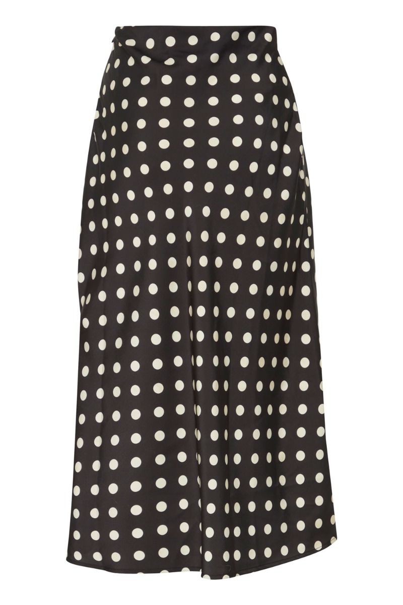 En fin nederdel i satin look fra Ichi i sort med hvid prikker. Den er med A snit og har både elastik i læynlås i taljen. Den er nem at styles til en t-shirt eller til en skjorte til fest.