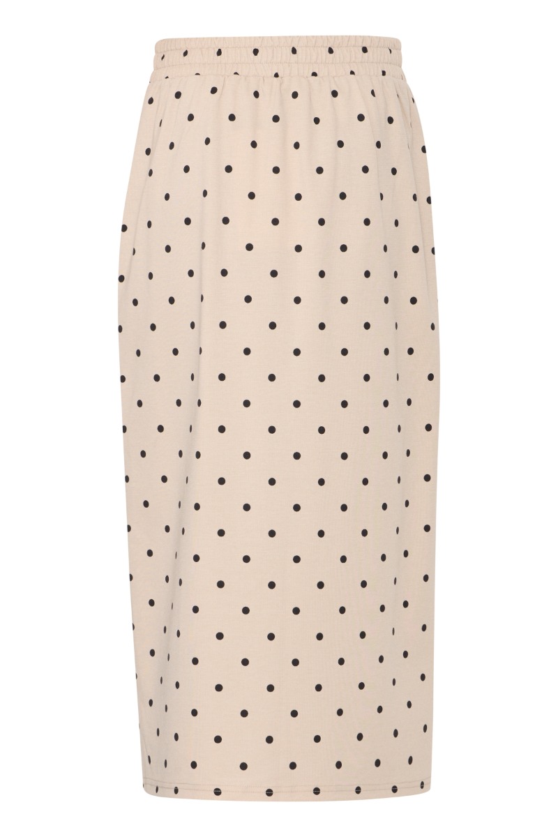 En sød nederdel i beige med sorte prikker er kommet fra Ichi. De er dejlige bløde i kvaliteten og er med stræk, derfor er den også behagelig at have på hele dagen. Der findes matchende overdele så du nemt kan lave et sæt.