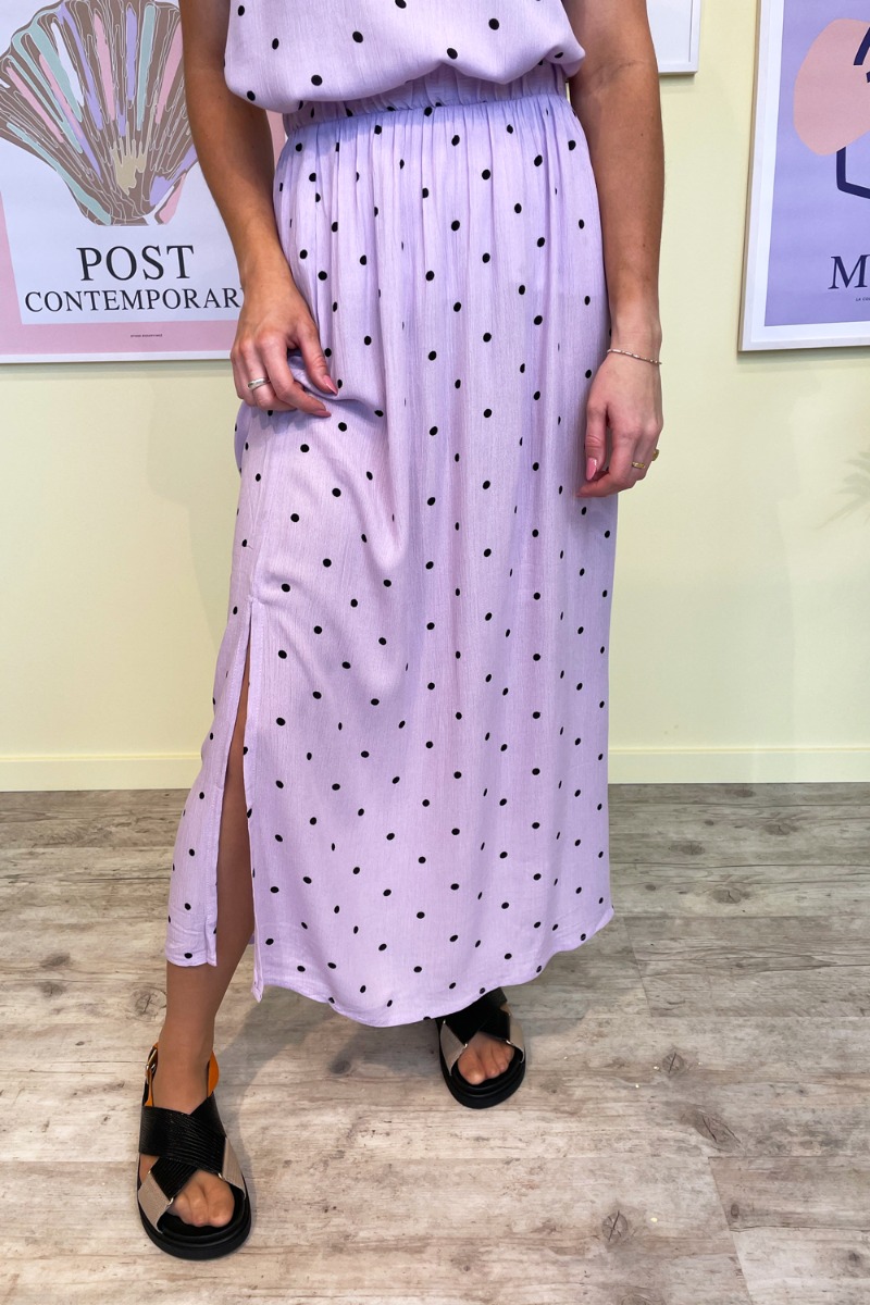 Flotteste nederdel fra ICHI i pastellilla med sorte prikker og slids i begge sider. Der er elastik i toppen af nederdelen som får den til at sidde helt perfekt i taljen. Så smuk en sommernederdel som du nemt kan style sammen med andre af dine styles fra garderoben.