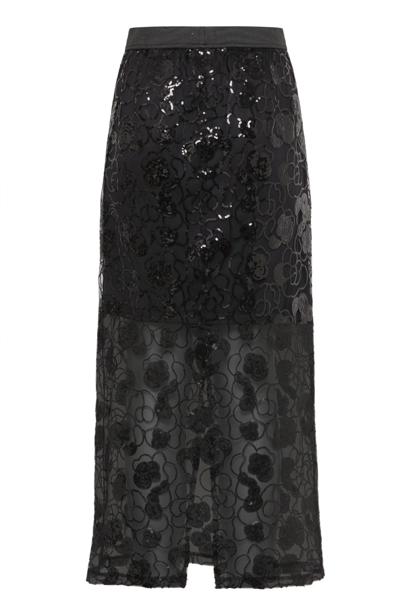 Nederdel fra Ichi. Denne nederdel har et festligt udtryk. Nederdelen er lang og foret i den øverste del. Fra knæet ca. og ned er den transparent. Den har elastik i taljen som sikrer god komfort hele dagen.