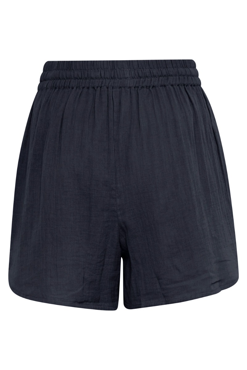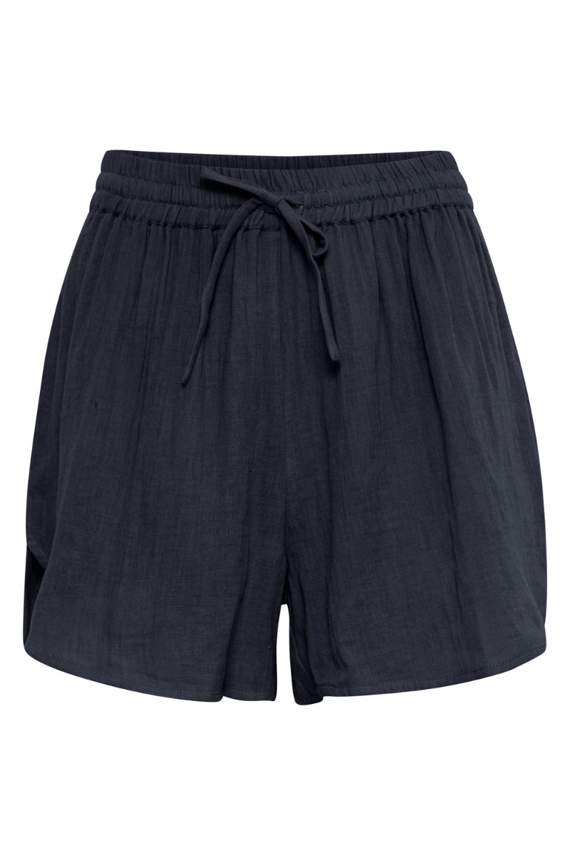 Skønneste hør shorts fra Ichi i en flot navy med matchende top til. Shortsene har et klassisk løst snit med en lilles lids detalje i siden. De har bred elastikkant i livet med snøre foran og i den blødeste kvalitet.