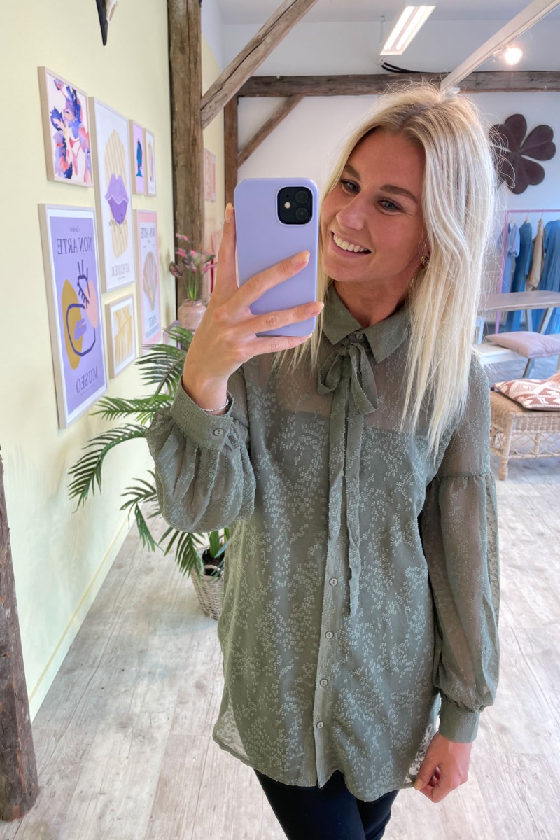 Let gennemsigtig skjorte fra Ichi i army med struktur. Skjorten lukkes foran med grønne knapper og har medfølgende bånd der kan bindes i kraven for at give en sød sløjfedetalje. Style den med en basis top under.