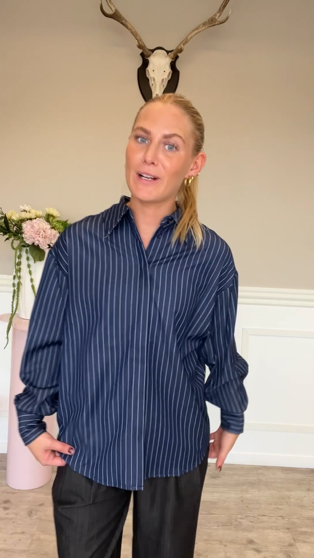 Den fineste skjorte fra Ichi er kommet med tynde nålestriber i hvid og i en navy farve. Den er med knapper og er derfor også ammevenlig. Derudover er den også med en knudedetalje bagpå som giver en smule figur og et flot snit. Der findes matchende bukser.