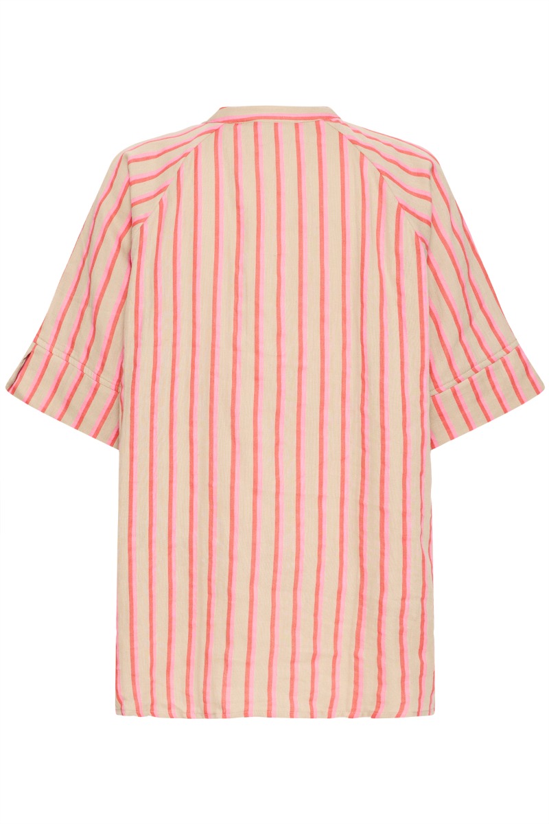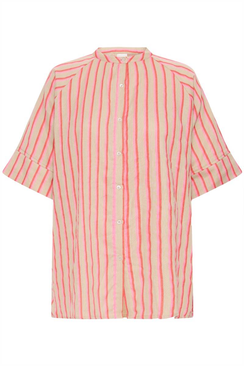 Let og luftig skjorte med korte ærmer i en blød beige tone med livlige pink striber, der giver et friskt og sommerligt udtryk. Designet med ståkrave, gennemgående knaplukning og en løs pasform, som sikrer god bevægelsesfrihed og komfort. Perfekt til varme dage – style den med matchende shorts eller lyse bukser for et afslappet, moderne look.