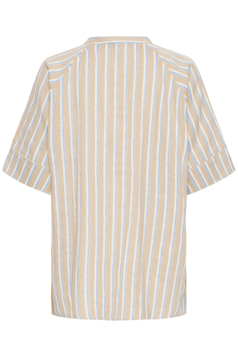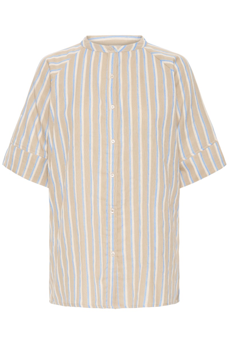 Let og sommerlig skjorte med korte ærmer og fine striber i beige og lyseblå nuancer. Designet med en enkel ståkrave og gennemgående knaplukning, som giver et afslappet, men stilrent udtryk. Den løse pasform og den lette kvalitet gør den behagelig at have på – perfekt til varme dage og casual outfits.