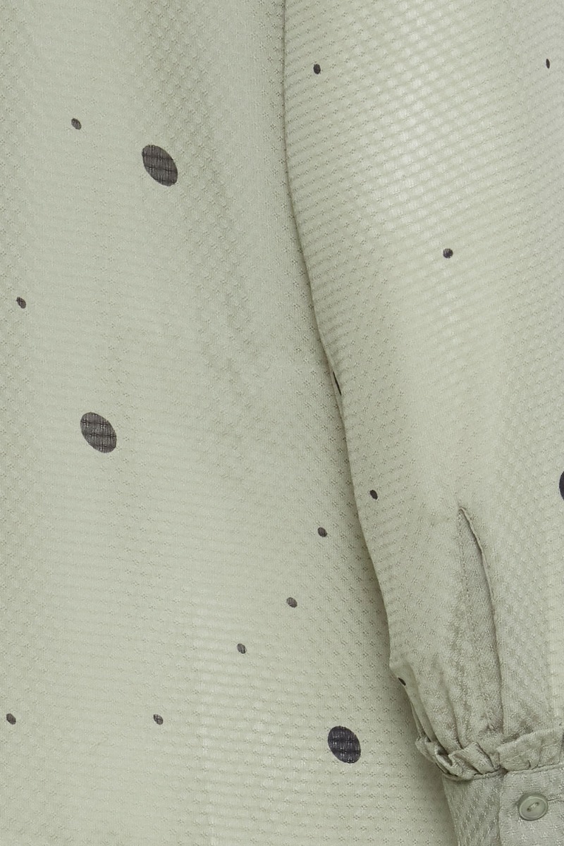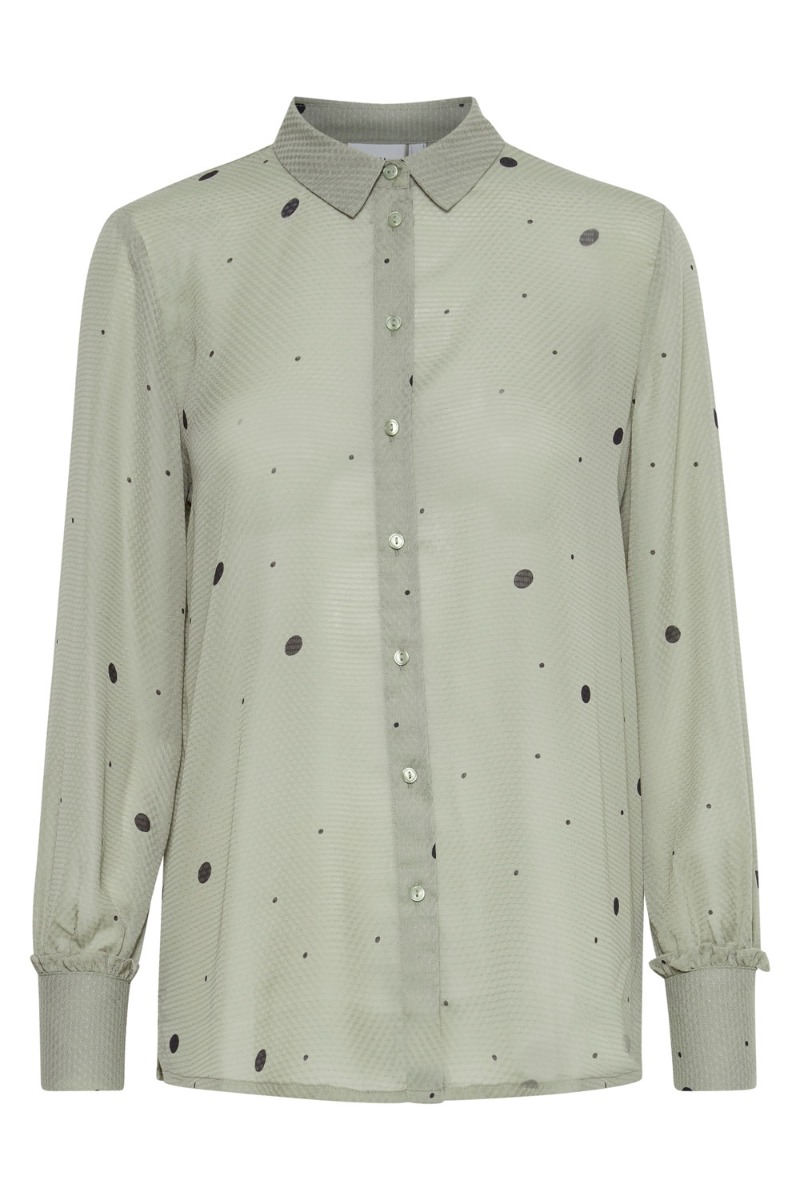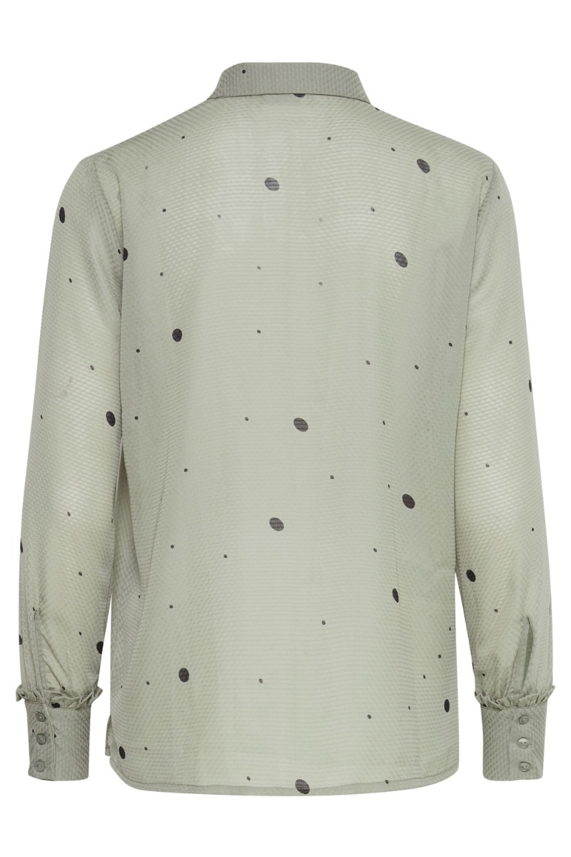 Grøn skjorte med sorte prikker fra Ichi i et let gennemsigtigt materiale. Skjorten lukkes foran med knapper og har en sød lille omvendt flæsedetalje ved håndleddet. Style den med en top under.