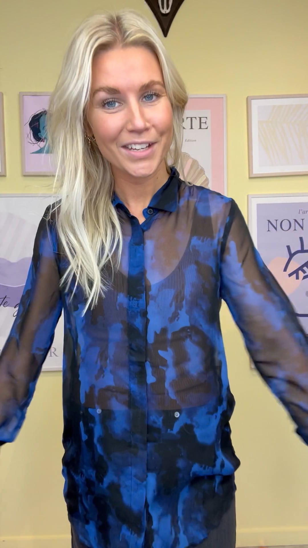 En fin skjorte i helt tyndt transparent materiale er kommet fra Ichi i sort og blåt print. Den er med klassisk skjorte krave og har skjult knaplukning foran. Derudover er den jo som sagt gennemsigtig og derfor anbefaler vi at du bruger en top under. Den er løs i pasformen og fin til et par jeans.