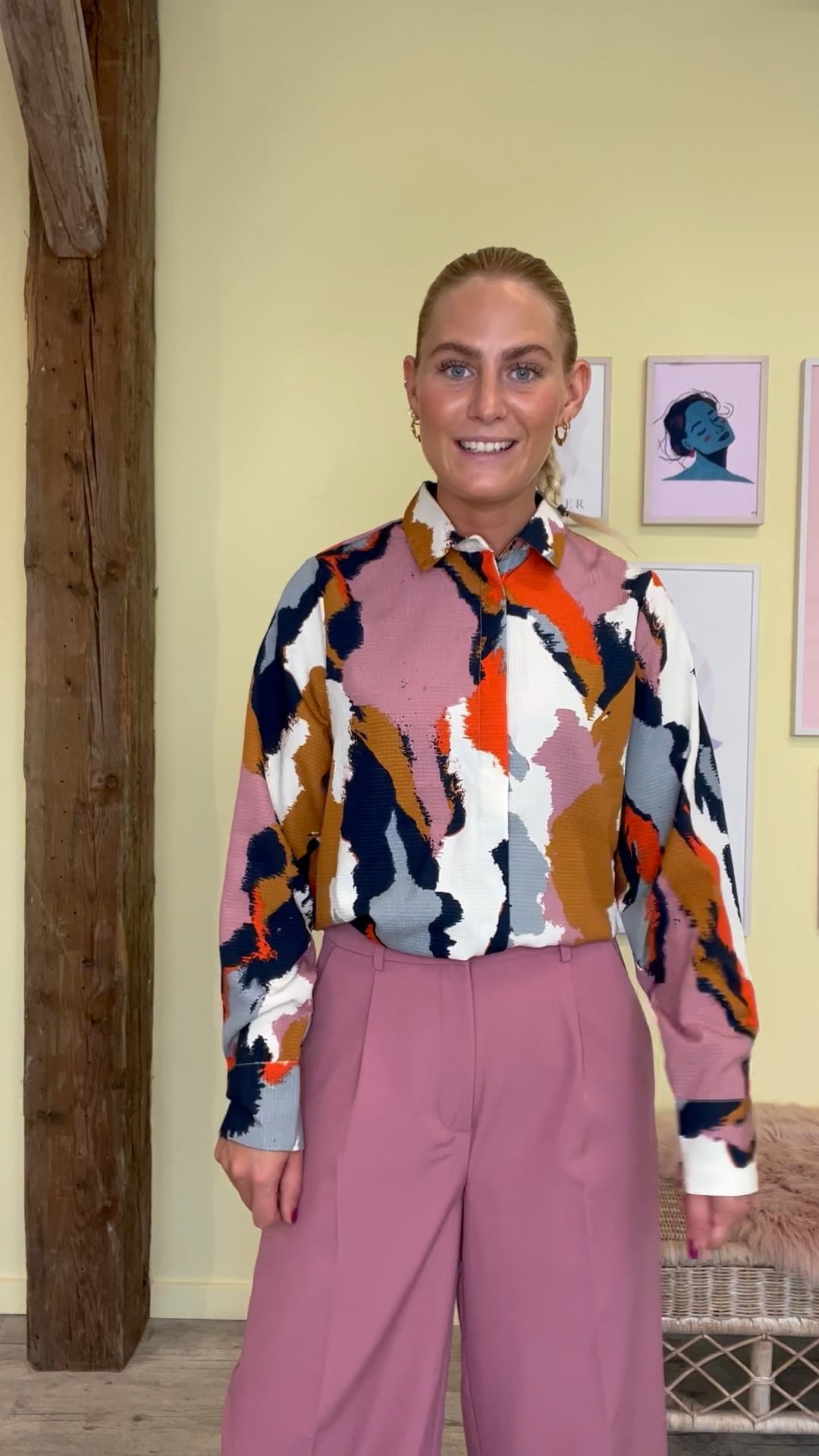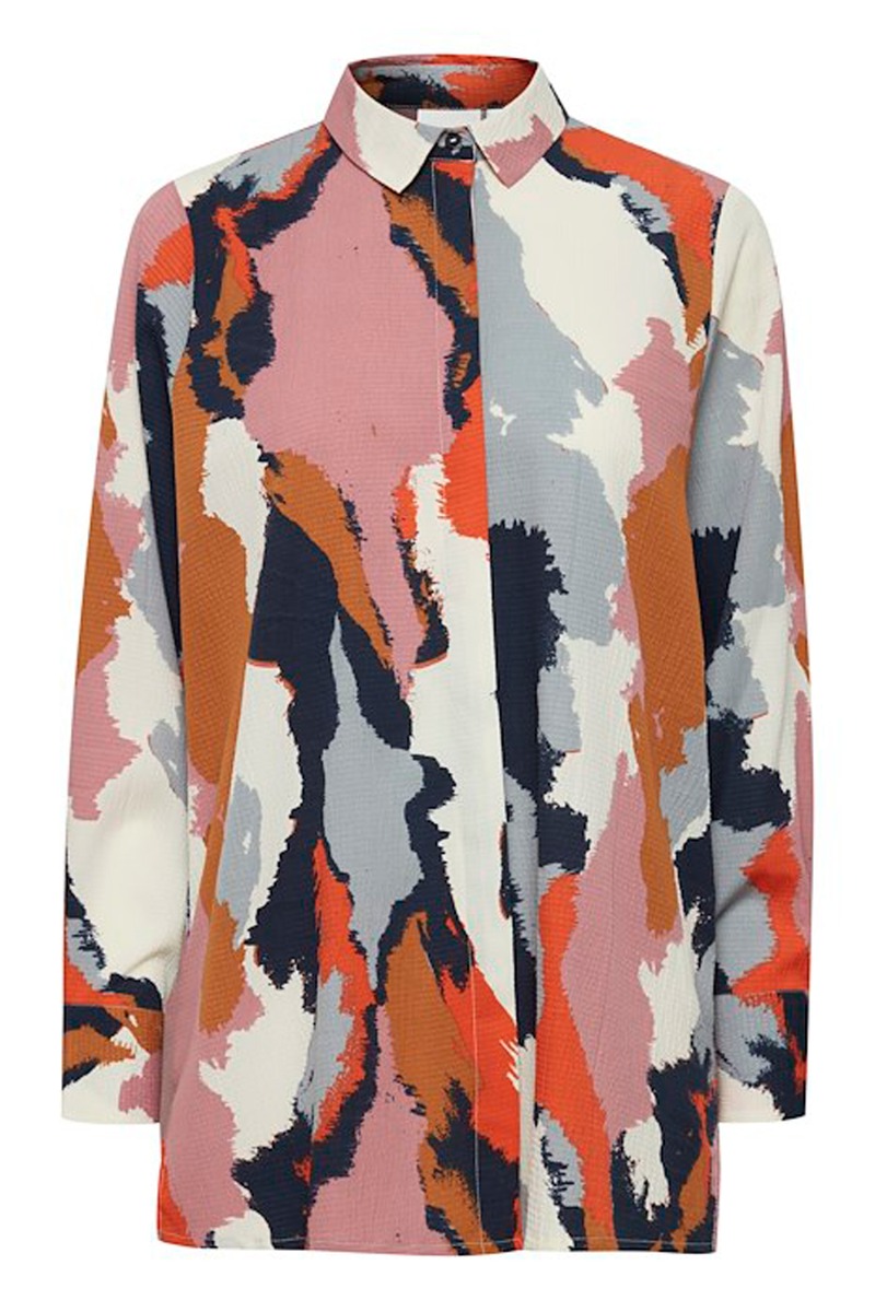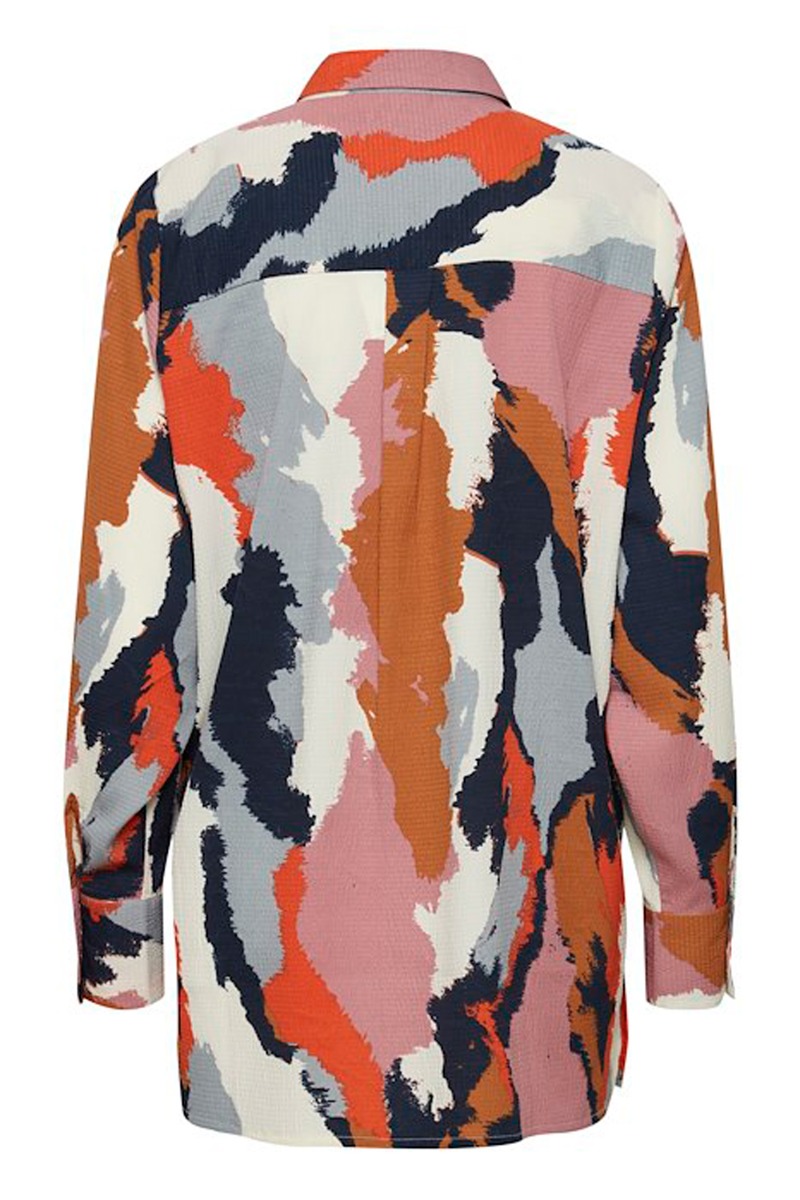 Multifarvet skjorte fra Ichi med plisseret detaljer. Bundfarven er hvid med grafisk print i flere skønne farver og perfekt til denne sæson vi går imøde. Den har et løstsiddende snit, så den er nem at hoppe i og klæder de fleste kropstyper. Foran lukkes den med knapper hele vejen ned.
