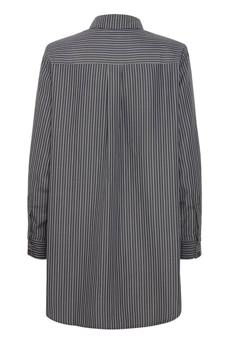 Mega sej oversized skjorte fra Ichi i gråstrib. Skjorten har en rummelig, løstsiddende og oversized snit. Den har klassiske skjortekrave med brystlommer og skulderpuder. Styl skjorten til de matchende bukser for et fuldendt look.