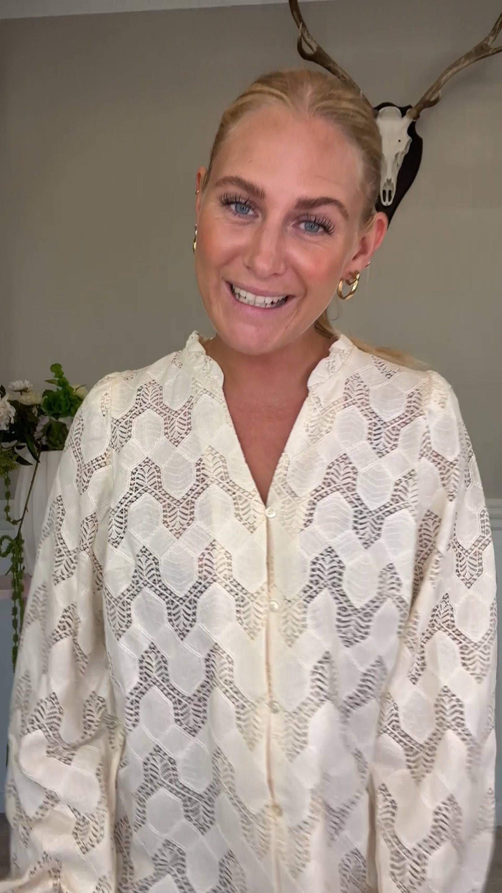 En super sød skjorte er landet fra Ichi med de fineste mønstre! Denne skjorte har flotte meshdetaljer, fyldige ærmer og en fin v-udskæring. Den er super fin både til fest og hverdag!