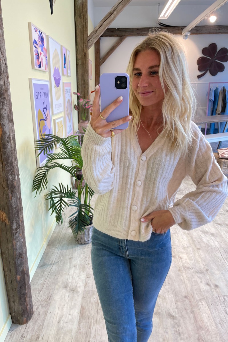 Enkel strik cardigan fra Ichi i hvid. Cardiganen har et helt simpel klassisk look med v-hals og stofbetrukket knapper foran. Den er nem at style til hverdag og findes i flere smukke farver.