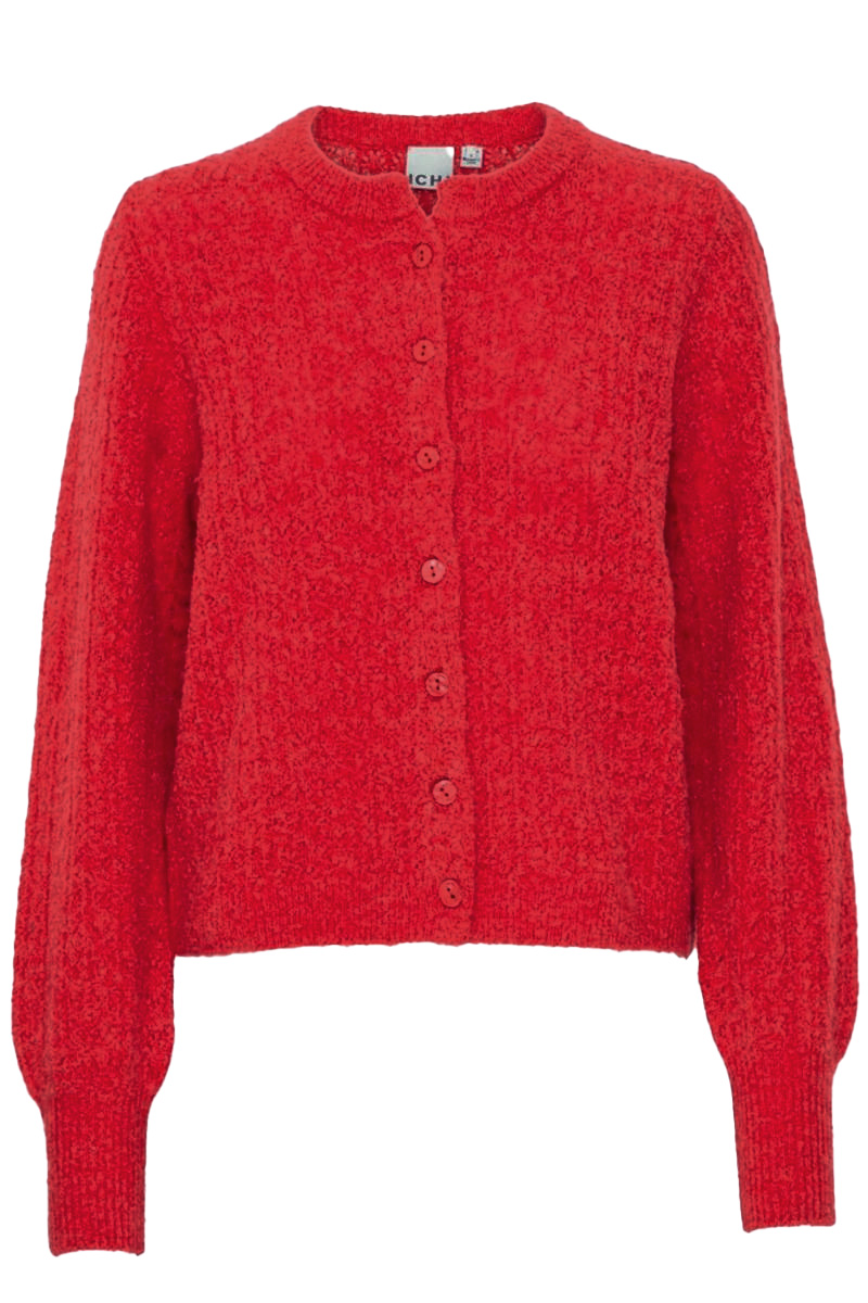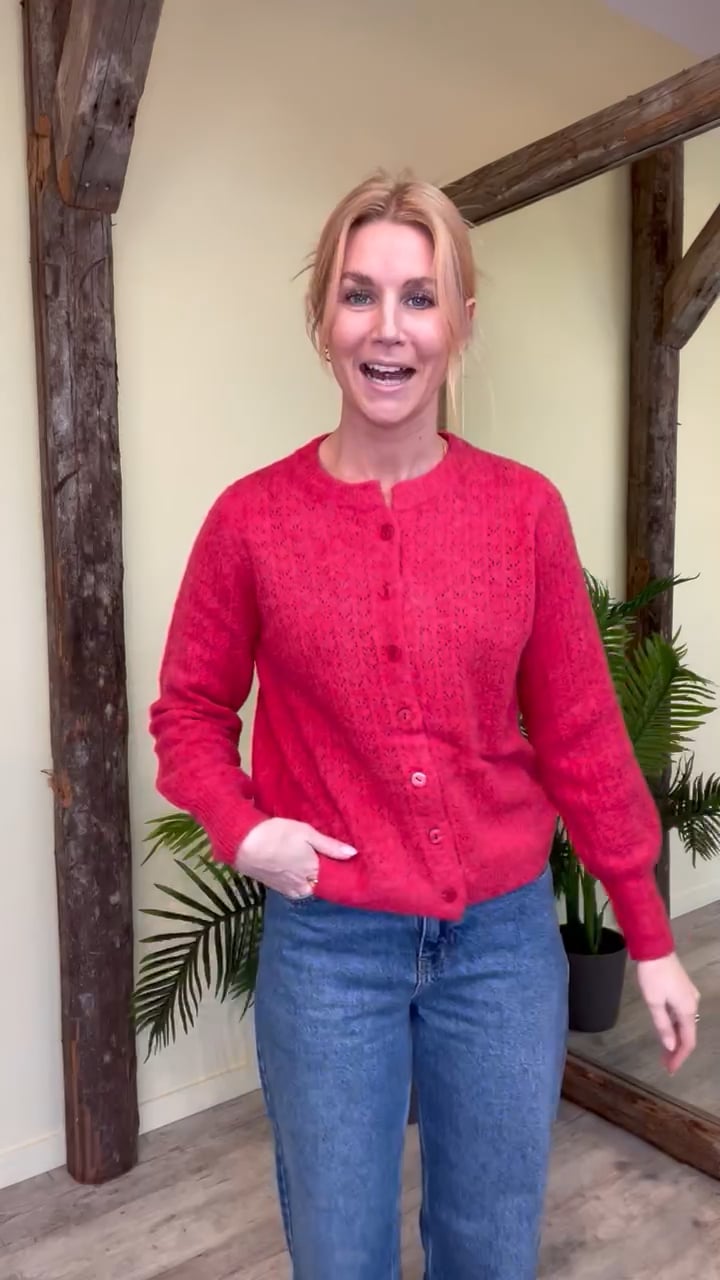 En fin strik cardigan fra Ichi er kommet i en mørke pink farve. Den er let i kvaliteten og løs i strikken, derfor er den en smule gennemsigtig og vi anbefaler at du bruger en top under. Den har rund halsudskæring og lukkes foran med knapper. Den findes også i blå.