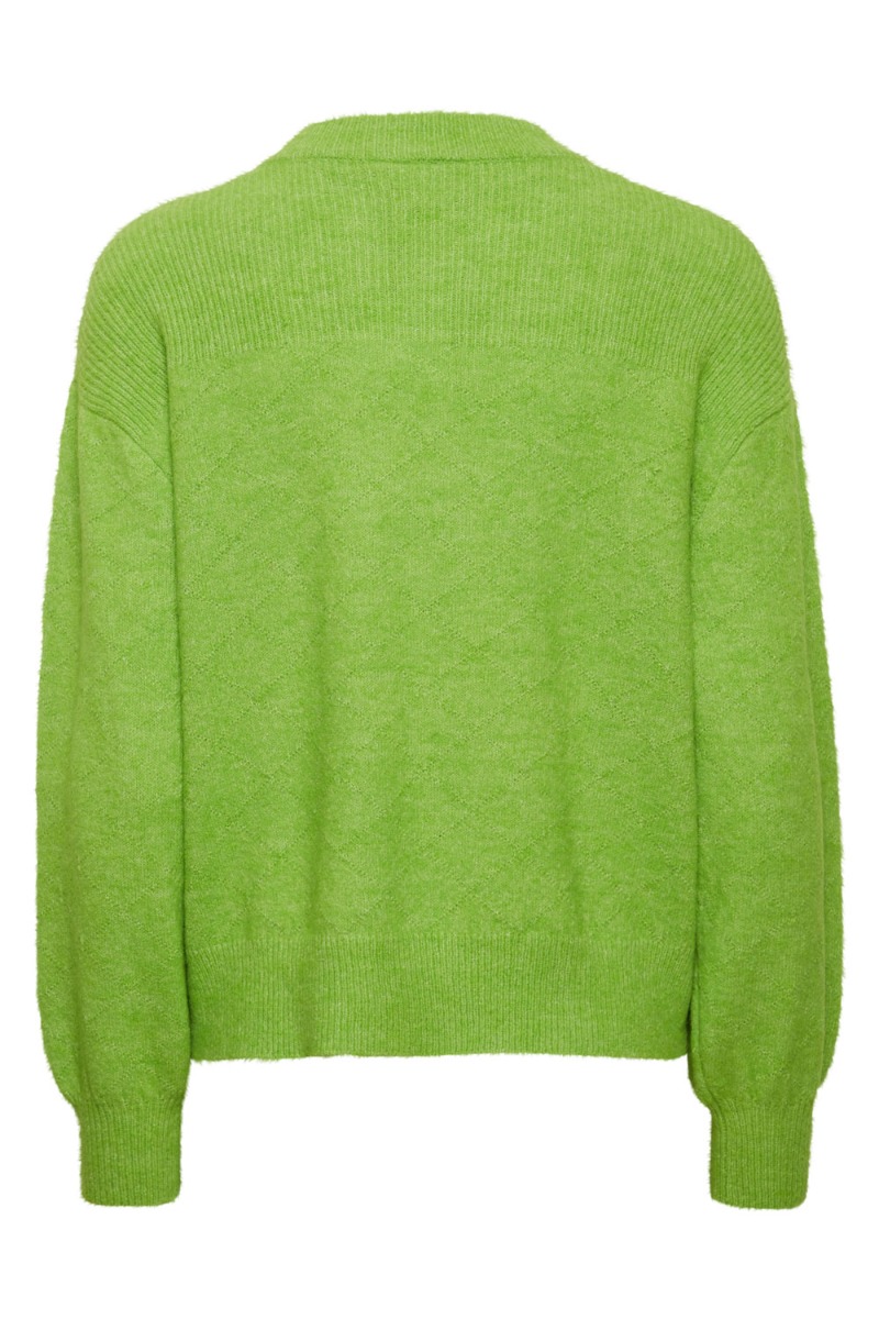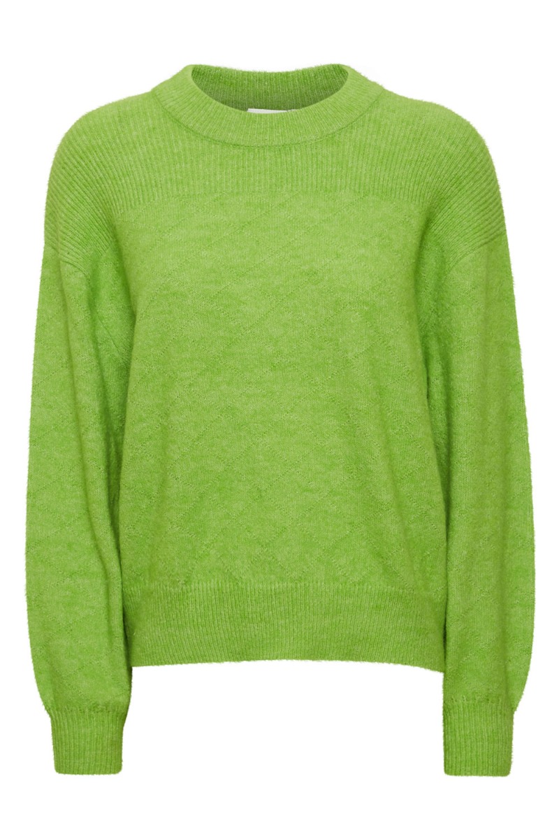 En strik i en smuk grøn farve er kommet til denne sæson fra Ichi. Den er dejlig blød i kvaliteten og kan bruges til både jeans og nederdel. Der er en smule mønster i strikken både med et ternet mønster og et rib mønster. Den er løs i pasformen og derfor kan du sagtens bruge den med en bluse eller top under.