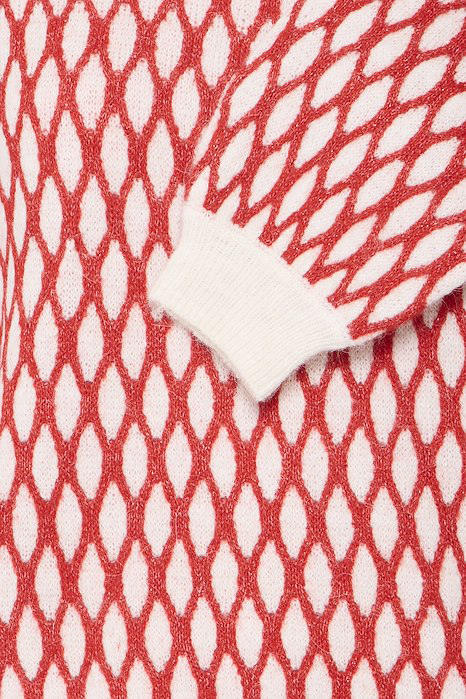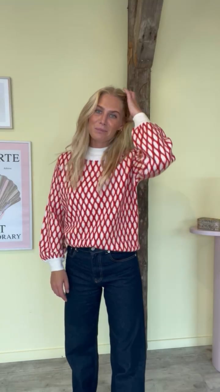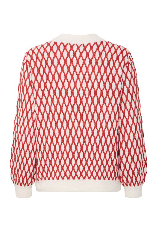 En super lækker strik er landet fra Ichi i de flotteste farver. Denne strik har et flot mønster, hvor der er en lille smule glimmer i den røde farve og ribkant i enderne! Strikken er så flot til et par jeans!