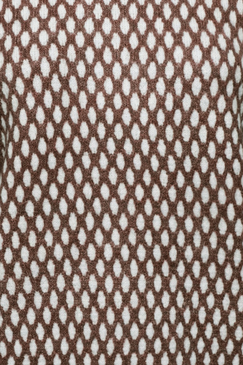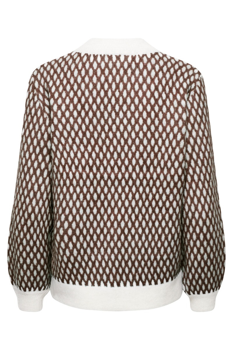 En hyggelig strik til de kolde efterårsdage fra Ichi. Strikken er lavet i en dejlig blød kvalitet med et ternet brunt og hvidt mønster der giver en rigtig hyggelig sommerhus stemning. Strikken er løs med o-neck og lange ærmer med en lille hvid ribkant i enden og ved håndleddet. Style den til et par cool jeans.